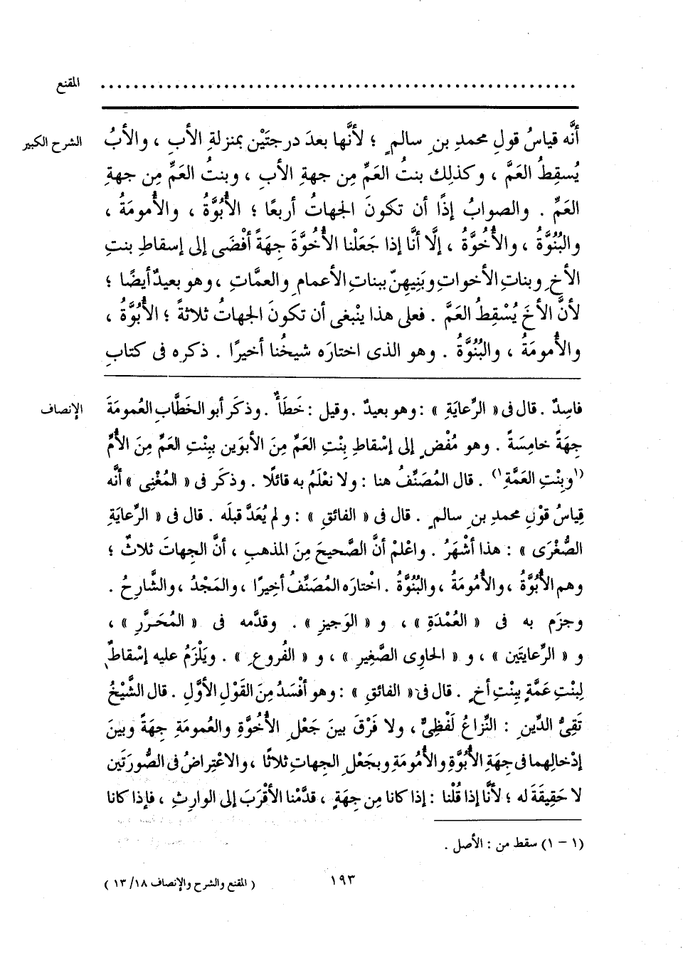 فاسِدٌ. قال في «الرِّعايَةِ»: وهو بعيدٌ. وقيل: خَطَأٌ. وذكَر أبو الخَطَّابِ العُمومَةَ جِهَةً خامِسَةً. وهو مُفْضٍ إلى إسْقاطِ بِنْتِ العَمِّ مِنَ الأبوَين ببِنْتِ العَمِّ مِنَ الأُمِّ [وَبِنْتِ العَمَّةِ] (¬1). قال المُصَنِّفُ هنا: ولا نعْلَمُ به قائلًا. وذكَر في «المُغْنِي» أنَّه قِياسُ قوْفِ محمدِ بنِ سالم. قال في «الفائقِ»: ولم يُعَدَّ قبلَه. قال في «الرِّعايَةِ الصُّغْرَى»: هذا أشْهَرُ. واعْلمْ أنَّ الصَّحيحَ مِنَ المذهبِ، أنَّ الجِهاتَ ثلاثٌ؛ وهم الأُبُوَّةُ، والأُمُومَةُ، والبُنُوةُ. اخْتارَه المُصَنِّفُ أخِيرًا، والمَجْدُ، والشَّارِحُ. وجزَم به في «العُمْدَةِ»، و «الوَجيزِ». وقدَّمه في «المُحَرَّرِ»، و «الرِّعايتَين»، و «الحاوي الصَّغِيرِ»، و «الفُروعِ». ويَلْزَمُ عليه إسْقاطٌ لِبنْتِ عَمَّةٍ ببِنْتِ أخٍ. قال في «الفائقِ»: وهو أفْسَدُ مِنَ القَوْلِ الأولِ. قال الشَّيخُ تَقِيُّ الدِّينِ: النِّزاعُ لَفْظِيٌّ، ولا فَرْقَ بينَ جَعْلِ الأُخُوةِ والعُمومَةِ جِهَةً وبينَ إدْخالِهما في جِهَةِ الأُبُوةِ والأمُومَةِ وبجَعْلِ الجِهاتِ ثلاثًا، والاعْتِراضُ في الصُّورَتَين لا حَقِيقَةَ له؛ لأنَّا إذا قُلْنا: إذا كانا مِن جِهَةٍ، قدَّمْنا الأقْرَبَ إلى الوارِثِ، فإذا كانا