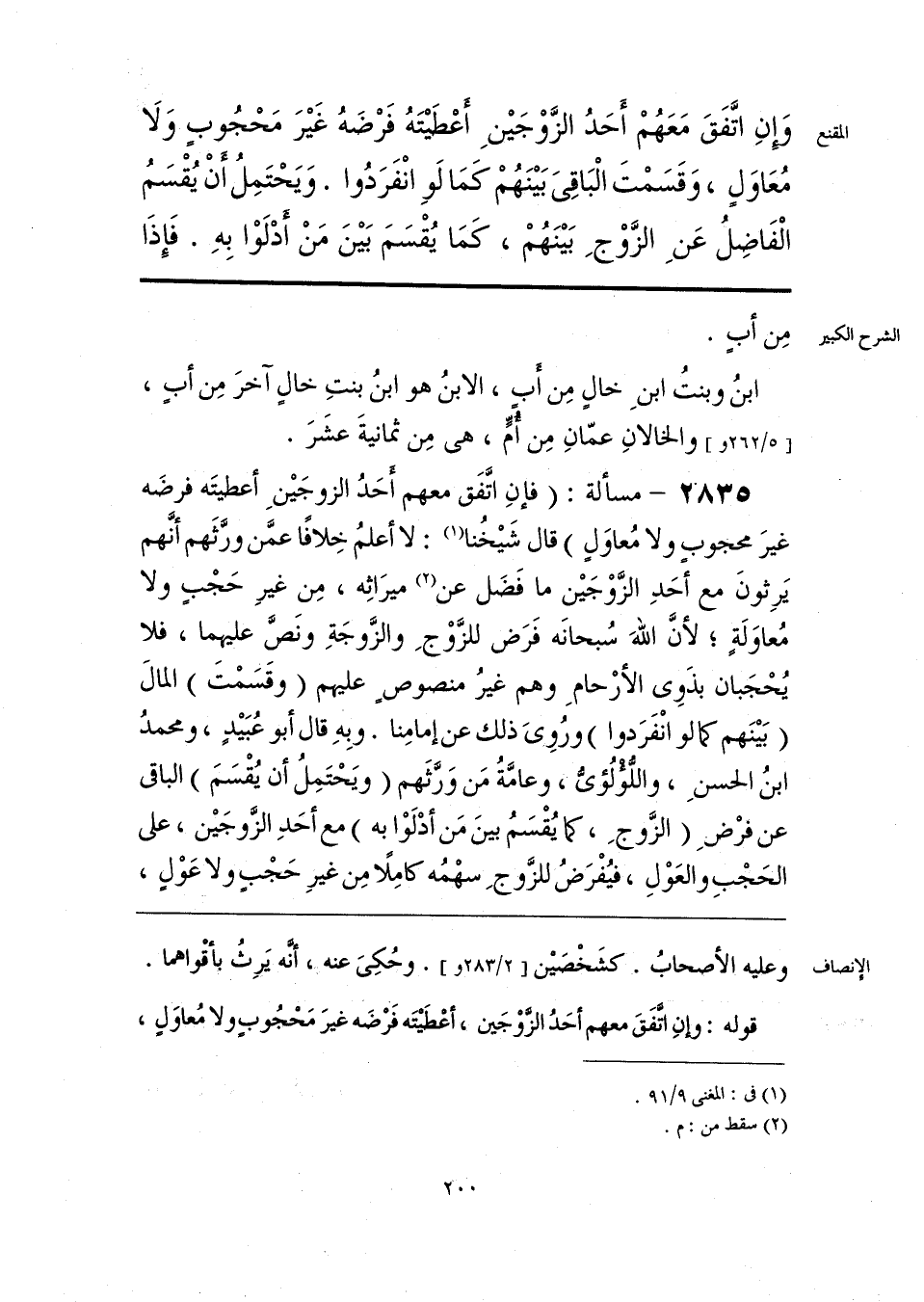 وَإنِ اتَّفَقَ مَعَهُمْ أَحَدُ الزَّوْجَينِ أعْطتَهُ فَرْضَهُ غَيرَ مَحْجُوبٍ وَلَا مُعَاوَلٍ، وَقَسَمْتَ الْبَاقِي بَينَهُمْ كَمَا لَو انْفَرَدُوا. وَيَحْتَمِلُ أن يُقْسَمُ الْفَاضِلُ عَنِ الزَّوْجِ بَينَهُمْ، كَمَا يُقْسَمَ بَينَ مَنْ أَدْلَوْا بِهِ. فَإذَا