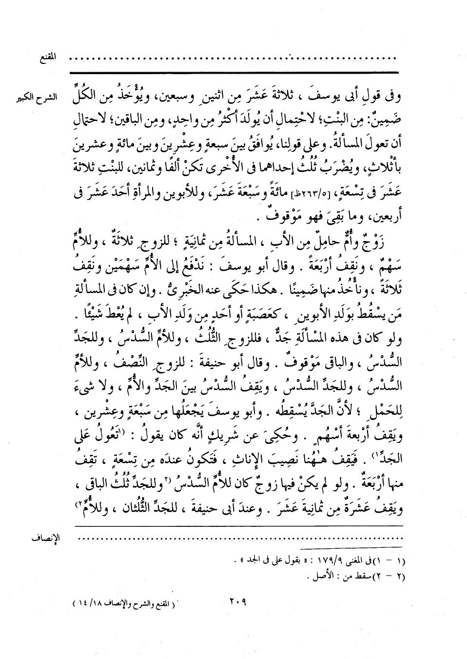 وفي قولِ أبي يوسفَ، ثلاثةَ عَشَرَ مِن اثنينِ وسبعين، ويُؤخَذُ مِن الكُلِّ ضَمِينٌ: مِن البنْتِ؛ لاحْتِمالِ أن يُولَدَ أكثر مِن واحِدٍ، ومِن الباقين؛ لاحتمالِ أن تعولَ المسألةُ. وعلى قولِنا، يُوافَقُ بينَ سبعةٍ وعِشْرِينَ وبينَ مائةٍ وعشرينَ بأثْلاثٍ، ويُضْرَبُ ثُلُثُ إحداهما في الأُخْرى تَكنْ ألفًا وثمانين، للبنْتِ ثلاثةَ عَشَرَ في تِسْعَةٍ، مائَةً وسَبْعَةَ عَشَرَ، وللأبوين والمرأةِ أحَدَ عَشَرَ في أربعين، وما بَقِيَ فهو مَوْقوفٌ.