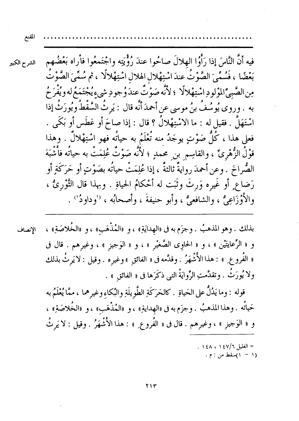 قوله: وما يَدُلُّ على الحَياةِ. كالحَرَكَةِ الطَّويلَةِ والبُكاءِ وغيرِهما، ممَّا يُعْلَمُ به حَياتُه. وهذا المذهبُ. وجزَم به في «الهِدايةِ»، و «المُذْهَبِ»، و «الخُلاصَةِ»، و «الوَجيزِ»، وغيرِهم. قال في «الفُروعِ»: هذا الأَشْهَرُ. وقيل: لا يَرِثُ