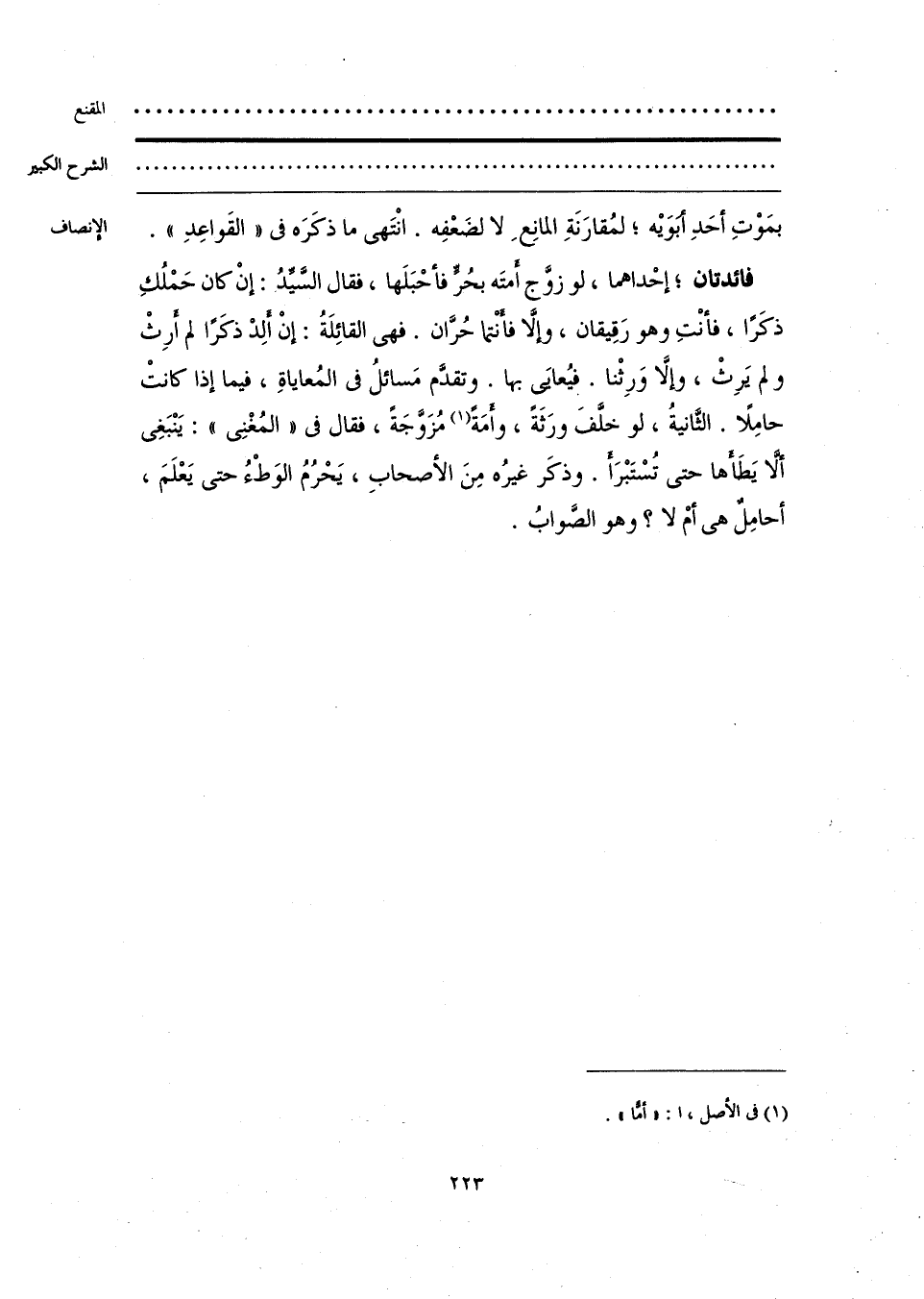 بمَوْتِ أحَدِ أَبَوَيه؛ لمقارَنَةِ المانِعِ لا لضَعْفِه. انْتَهى ما ذكَرَه في «القَواعِدِ». فائدتان؛ إحْداهما، لو زوَّج أمتَه بحُرٍّ فأحْبَلَها، فقال السَّيِّدُ: إنْ كان حَمْلُكِ ذكَرًا، فأنْتِ وهو رَقِيقان، وإلَّا فأَنْتما حُرَّان. فهي القائِلَةُ: إنْ أَلِدْ ذكَرًا لم أَرِثْ ولم يَرِثْ، وإلَّا وَرِثْنا. فيُعايَى بها. وتقدَّم مَسائلُ في المُعاياةِ، فيما إذا كانتْ حامِلًا. الثَّانيةُ، لو خلَّفَ ورَثَةً، وأمَةً (¬1) مُزَوَّجَةً، فقال في «المُغْنِي»: يَنْبَغِي ألا يَطَأَها حتَّى تُسْتَبْرَأ. وذكَر غيرُه مِنَ الأصحابِ، يَحْرُمُ الوَطْءُ حتَّى يَعْلَمَ، أحامِلٌ هي أمْ لا؟ وهو الصَّوابُ.