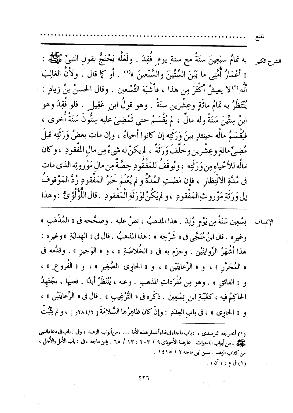 تِسْعِين سَنَةً مِن يَوْمِ وُلِدَ. هذا المذهبُ، نصَّ عليه. وصحَّحه في «المُذْهَبِ» وغيرِه. قال ابنُ مُنَجَّى في «شَرْحِه»: هذا المذهبُ. قال في «الهِدايَةِ» وغيرِه: هذا أشْهَرُ الرِّوايتَين. وجزَم به في «الخُلاصَةِ»، و «الوَجيزِ». وقدَّمه في «المُحَرَّرِ»، و «الرعايتَين»، و «الحاوي الصَّغِيرِ»، و «الفُروعِ»، و «الفائقِ». وهو مِن مُفْرَداتِ المذهبِ. وعنه، يُنْتَظَرُ أبدًا. فعليها، يجْتَهِدُ الحاكِمُ فيه، كغيبَةِ ابنِ تِسْعِين. ذكَره في «التَّرْغِيبِ». قال في «الرِّعايتَين»، و «الحاوي»، في بابِ العِدَدِ: وإنْ كان ظاهِرُها السَّلامَةَ، ولم يثْبُتْ