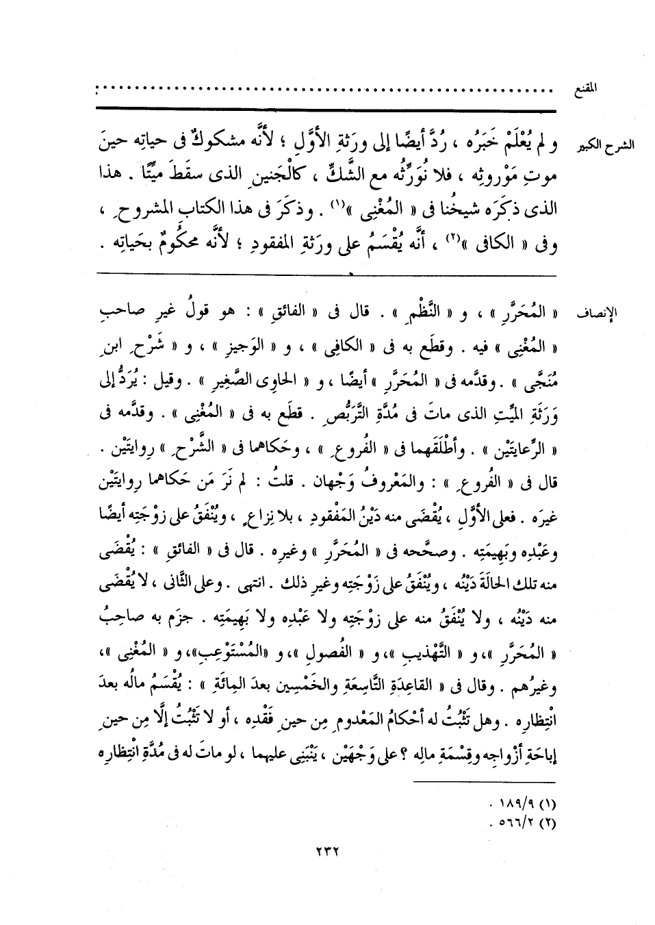 «المُحَرَّرِ»، و «النَّظْمِ». قال في «الفائقِ»: هو قولُ غيرِ صاحبِ «المُغْنِي» فيه. وقطَع به في «الكافِي»، و «الوَجيزِ»، و «شَرْحِ ابنِ مُنَجَّى». وقدَّمه في «المُحَرَّرِ» أيضًا، و «الحاوي الصَّغِيرِ». وقيل: يُرَدُّ إلى وَرَثَةِ الميِّتِ الذي ماتَ في مُدَّةِ التَّرَبُّصِ. قطَع به في «المُغْنِي». وقدَّمه في «الرِّعايتَين». وأطْلَقَهما في «الفُروعِ»، وحَكاهما في «الشَّرْحِ» رِوايتَين. قال في «الفُروعِ»: والمَعْروفُ وَجْهان. قلتُ: لم نَرَ مَن حَكاهما رِوايتَين غيرَه. فعلى الأوَّلِ، يُقْضَى منه دَينُ المَفْقودِ، بلا نِزاعٍ، ويُنْفَقُ على زوْجَتِه أيضًا وعَبْدِه وبَهِيمَتِه. وصحَّحه في «المُحَرَّرِ» وغيرِه. قال في «الفائقِ»: يُقْضَى منه تلك الحالةَ دَينُه، ويُنْفَقُ على زَوْجَتِه وغيرِ ذلك. انتهى. وعلى الثَّاني، لا يُقْضَى منه دَينُه، ولا يُنْفَقُ منه على زوْجَتِه ولا عَبْدِه ولا بَهِيمَتِه. جزَم به صاحِبُ «المُحَرَّرِ»، و «التَّهْذيبِ»، و «الفُصولِ»، و «المُسْتَوْعِبِ»، و «المُغْنِي»، وغيرُهم. وقال في «القاعِدَةِ التَّاسِعَةِ والخَمْسِين بعدَ المِائَةِ»: يُقْسَمُ مالُه بعدَ انْتِظارِه. وهل تَثْبُتُ له أحْكامُ المَعْدومِ مِن حينِ فَقْدِه، أو لا تَثْبُتُ إلَّا مِن حينِ إباحَةِ أزْواجِه وقِسْمَةِ مالِه؟ على وَجْهَين، يَنْبَنِي عليهما، لو ماتَ له في مُدَّةِ انْتِظارِه