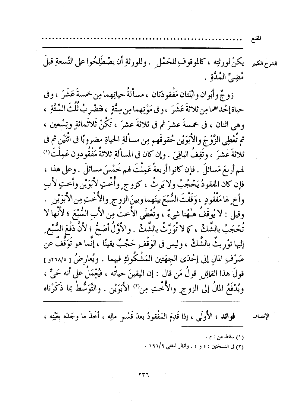 فوائد: الأُولَى، إذا قَدِمَ المَفْقودُ بعدَ قَسْمِ مالِه، أخَذَ ما وجَدَه بعَينِه،