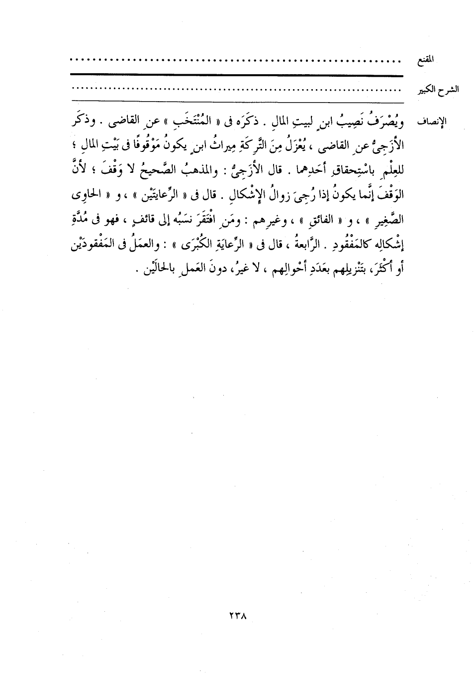 ويُصْرَفُ نَصِيبُ ابنٍ لبيتِ المالِ. ذكَرَه في «المُنْتَخَبِ» عنِ القاضي. وذكَر الأزَجِيُّ عنِ القاضي، يُعْزَلُ مِنَ التَّرِكَةِ مِيراثُ ابنٍ يكونُ مَوْقُوفًا في بَيتِ المالِ؛ للعِلْمِ باسْتِحقاقِ أحَدِهما. قال الأزَجِيُّ: والمذهبُ الصَّحيحُ لا وَقْفَ؛ لأنَّ الوَقْفَ إنَّما يكونُ إذا رُجِيَ زوالُ الإِشْكالِ. قال في «الرِّعايتَين»، و «الحاوي الصَّغِيرِ»، و «الفائقِ»، وغيرِهم: ومَنِ افْتَقَرَ نسَبُه إلى قائفٍ، فهو في مُدَّةِ إشْكالِه كالمَفْقُودِ. الرَّابعةُ، قال في «الرعايَةِ الكُبْرَى»: والعمَلُ في المَفْقودَين أو أكْثَرَ، بتَنْزيلِهم بعَدَدِ أحْوالِهم، لا غيرُ، دونَ العَملِ بالحالين.