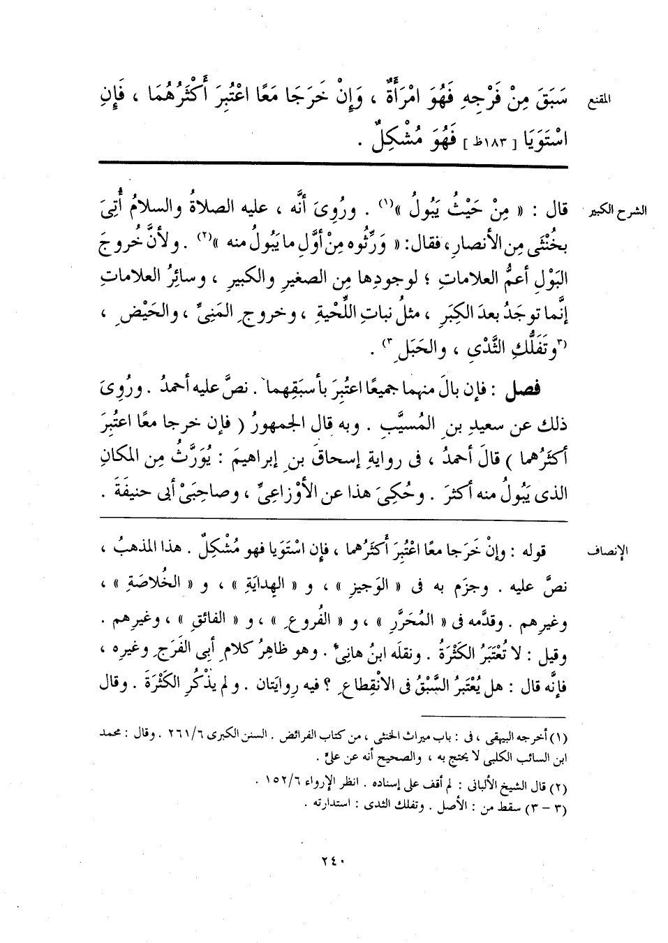 قوله: وإنْ خَرَجا معًا اعْتُبِرَ أكثَرُهما، فإن اسْتَوَيا فهو مُشْكِلٌ. هذا المذهبُ، نصَّ عليه. وجزَم به في «الوَجيزِ»، و «الهدايَةِ»، و «الخُلاصَةِ»، وغيرِهم. وقدَّمه في «المُحَرَّرِ»، و «الفُروعِ»، و «الفائقِ»، وغيرِهم. وقيل: لا تُعْتَبَرُ الكَثْرَةُ. ونقلَه ابنُ هانِئ. وهو ظاهِرُ كلامِ أبِي الفَرَجِ وغيرِه، فإنَّه قال: هل يُعْتَبرُ السَّبْقُ في الانْقِطاعِ؟ فيه رِوايَتان. ولم يذكُرِ الكَثْرَةَ. وقال
