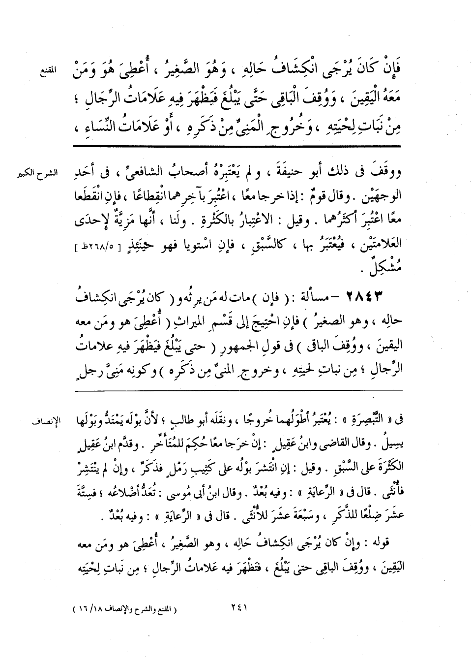 قوله: وإنْ كان يُرْجَى انكِشافُ حَالِه، وهو الصَّغِيرُ، أُعْطِيَ هو ومَن معه اليَقِينَ، ووُقِفَ الباقِي حتى يَبلُغَ، فتَظْهَرَ فيه عَلاماتُ الرِّجالِ؛ مِن نَباتِ لِحْيَتِه