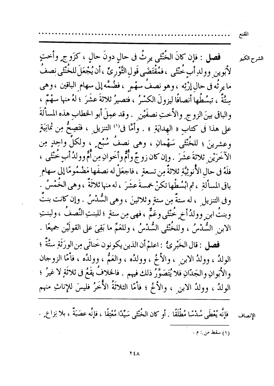 فإنَه يُعْطَى سُدْسًا مُطْلَقًا. أو كان الخُنْثَى سَيِّدًا مُعْتِقًا، فإنَه عصَبَةٌ، بلا نِزاعٍ.