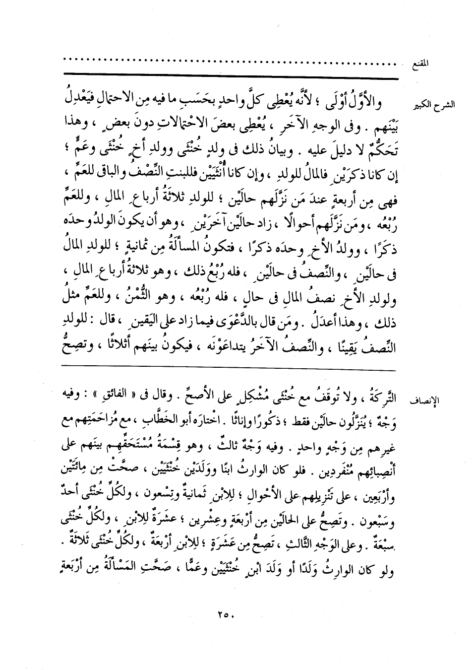 التَّرِكَةُ، ولا تُوقَفُ مع خُنْثَى مُشْكِلٍ على الأصحِّ. وقال في «الفائقِ»: وفيه وَجْهٌ؛ يُنَزَّلُون حالَيْن فقط؛ ذكُورًا وإناثًا. اخْتارَه أبو الخَطَّابِ، مع مُزاحَمَتِهم مع غيرِهم مِن وَجْهٍ واحدٍ. وفيه وَجْهٌ ثالثٌ، وهو قِسْمَةُ مُسْتَحَقِّهِم بينَهم على أنْصِبائِهم مُنْفَردِين. فلو كان الوارثُ ابنًا ووَلَدَين خُنْثَيَين، صحَّتْ مِن مِائَتَين وأرْبَعِين، على تَنْزِيِلِهم. على الأحْوالِ؛ للِابْنِ ثَمانيةٌ وتِسْعون، ولكُلِّ خُنْثَى أحدٌ وسَبْعون. وتَصِحُّ على الحالين مِن أرْبعَةٍ وعِشْرِين؛ عشَرَة للِابْنِ، ولكُلِّ خُنْثَى سبْعَةٌ. وعلى الوَجْهِ الثَّالثِ، تَصِحُّ مِن عَشَرَةٍ؛ للِابْنِ أرْبعَةٌ، ولكُلِّ خُنْثَى ثَلاثةٌ. ولو كان الوارِثُ وَلَدًا أو وَلَدَ ابْن خُنْثَيَين وعَمًّا، صَحَّتِ المَسْألَةُ مِن أرْبَعةٍ