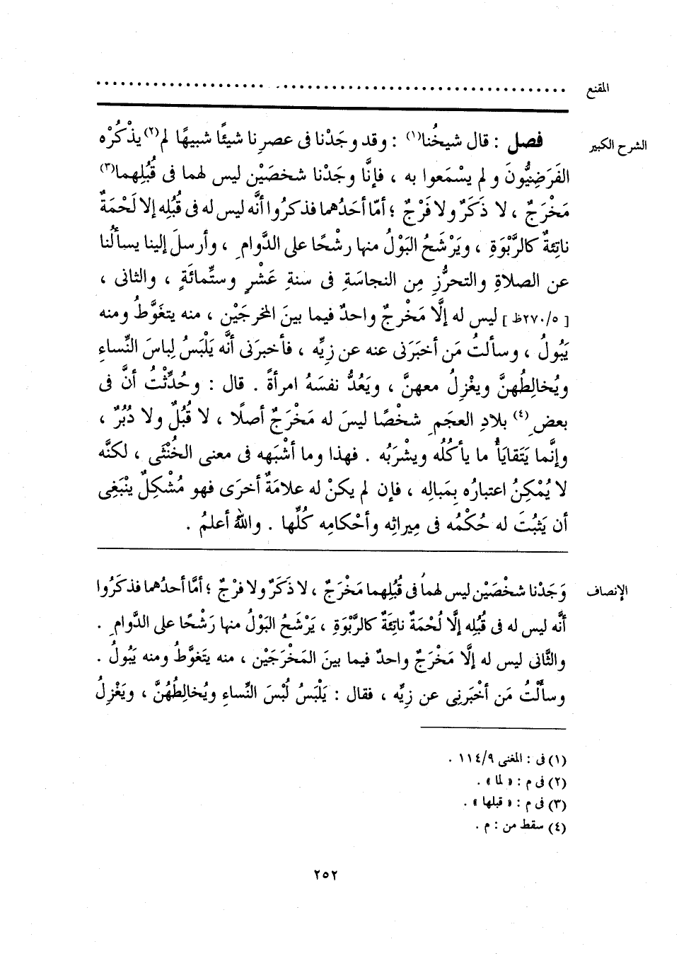 وَجَدْنا شخْصَين ليس لهما في قُبُلِهما مَخْرَجٌ، لا ذَكَر ولا فرْجٌ؛ أمّا أحدُهما فذكَرُوا أنَّه ليس له في قُبُلِه إلَّا لُحْمَةٌ ناتِئَةٌ كالرَّبْوَةِ، يَرْشَحُ البَوْلُ منها رَشْحًا على الدَّوامِ. والثَّاني ليس له إلَّا مَخْرَجٌ واحدٌ فيما بينَ المَخْرَجَين، منه يتَغوَّطُ ومنه يَبُولُ. وسألتُ مَن أخْبَرنِي عن زِيِّه، فقال: يَلْبَسُ لُبْسَ النِّساءِ ويُخالِطُهُنَّ، ويَغْزِلُ