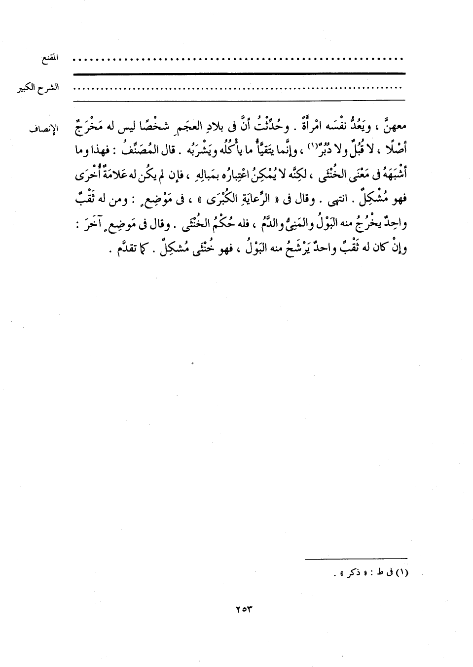 معهنَّ، ويَعُدُّ نفْسَه امْرأَةً. وحُدِّثْتُ أنَّ في بلادِ العجَمِ شخْصًا ليس له مَخْرَجٌ أصْلًا، لا قُبُلٌ ولا دُبُرٌ (¬1)، وإنَّما يتَقيَّأُ ما يأْكُلُه ويَشْرَبُه. قال المُصَنِّفُ: فهذا وما أشْبَهَهُ في مَعْنَى الخُنْثَى، لكِنَّه لا يُمْكِنُ اعْتِبارُه بمَبالِهِ، فإن لم يكُن له عَلامَةٌ أُخْرَى فهو مُشْكِلٌ. انتهى. وقال في «الرِّعايَةِ الكُبْرَى»، في مَوْضِعٍ: ومن له ثَقْبٌ واحِدٌ يخْرُجُ منه البَوْلُ والمَنِيُّ والدَّمُ، فله حُكْمُ الخُنْثَى. وقال في مَوضِعٍ آخَرَ: وإنْ كان له ثَقْبٌ واحدٌ يَرْشَحُ منه البَوْلُ، فهو خُنْثَى مُشكِلٌ. كما تقدَّم.