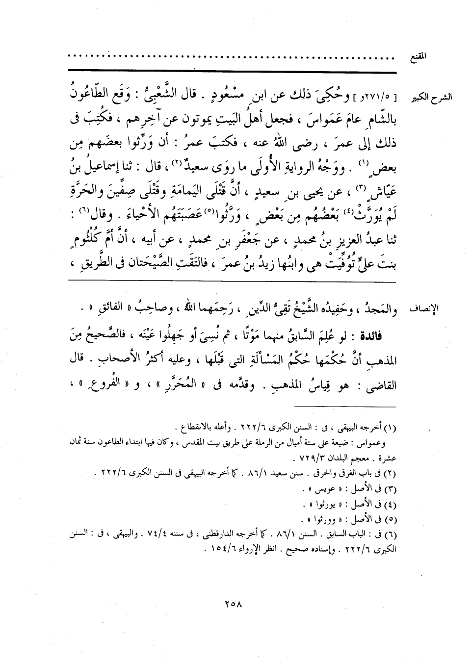 فائدة: لو عُلِمَ السَّابقُ منهما مَوْتًا، ثم نُسِيَ أو جَهِلُوا عَينَه، فالصَّحيحُ مِنَ المذهبِ أنَّ حُكْمَها حُكْمُ المَسْألَةِ التي قَبْلَها، وعليه أكثرُ الأصحابِ. قال القاضي: هو قِياسُ المذهبِ. وقدَّمه في «المُحَرَّرِ»، و «الفُروعِ»،