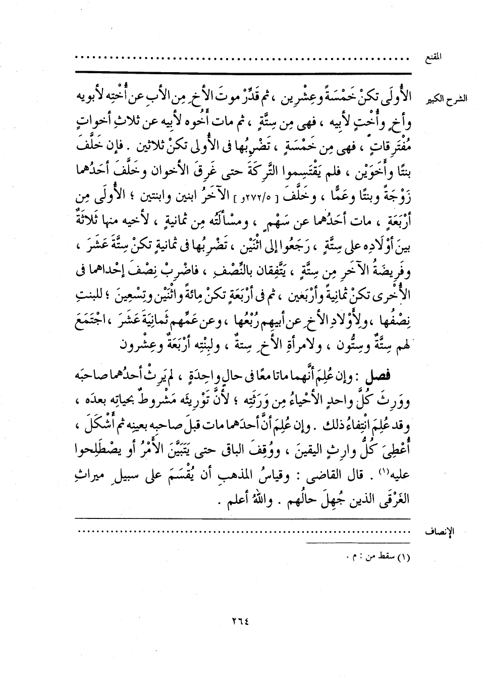 الأُولَى تكنْ خَمْسَةً وعِشْرِين، ثم قَدِّرْ موتَ الأخِ مِن الأبِ عن أُختِه لأبويه وأخٍ وأُخْتٍ لأبِيه، فهي مِن سِتَّةٍ، ثم مات أُخُوه لأبِيه عن ثلاثِ أخواتٍ مُفْتَرِقاتٍ، فهي مِن خَمْسَةٍ، تَضْرِبُها في الأُولى تكنْ ثلاثين. فإن خَلَّفَ بنتًا وأَخَوَين، فلم يَقْتَسِموا التَّرِكَةَ حتى غَرِقَ الأخوان وخَلَّفَ أحَدُهما زَوْجَةً وبنتًا وعَمًّا، وخَلَّفَ الآخَرُ ابنين وابنتين؛ الأُولَى مِن أرْبَعَةٍ، مات أحَدُهما عن سَهْمٍ، ومسْألَتُه مِن ثمانيةٍ، لأخيه منها ثَلاثَةٌ بينَ أوْلَادِه على سِتَّةٍ، رَجَعُوا إلى اثْنَين، تَضْرِبُها في ثمانيةٍ تكنْ سِتَّةَ عَشَرَ، وفَرِيضَةُ الآخرِ مِن سِتَّةٍ، يَتَّفِقان بالنصْفِ، فاضْرِبْ نِصْفَ إحْداهما في الأُخْرى تكنْ ثمانِيةً وأرْبَعين، ثم في أرْبَعَةٍ تكنْ مِائةً واثْنَين وتِسْعِينَ؛ للبنتِ نِصْفُها، ولِأوْلادِ الأخِ عن أبيهِم رُبْعُها، وعن عَمِّهم ثَمانِيَةَ عَشَرَ، اجْتَمَعَ لهم سِتَّةٌ وسِتُّون، ولامرأةِ الأخِ سِتةٌ، ولبِنْتِه أرْبَعَةٌ وعِشْرون.