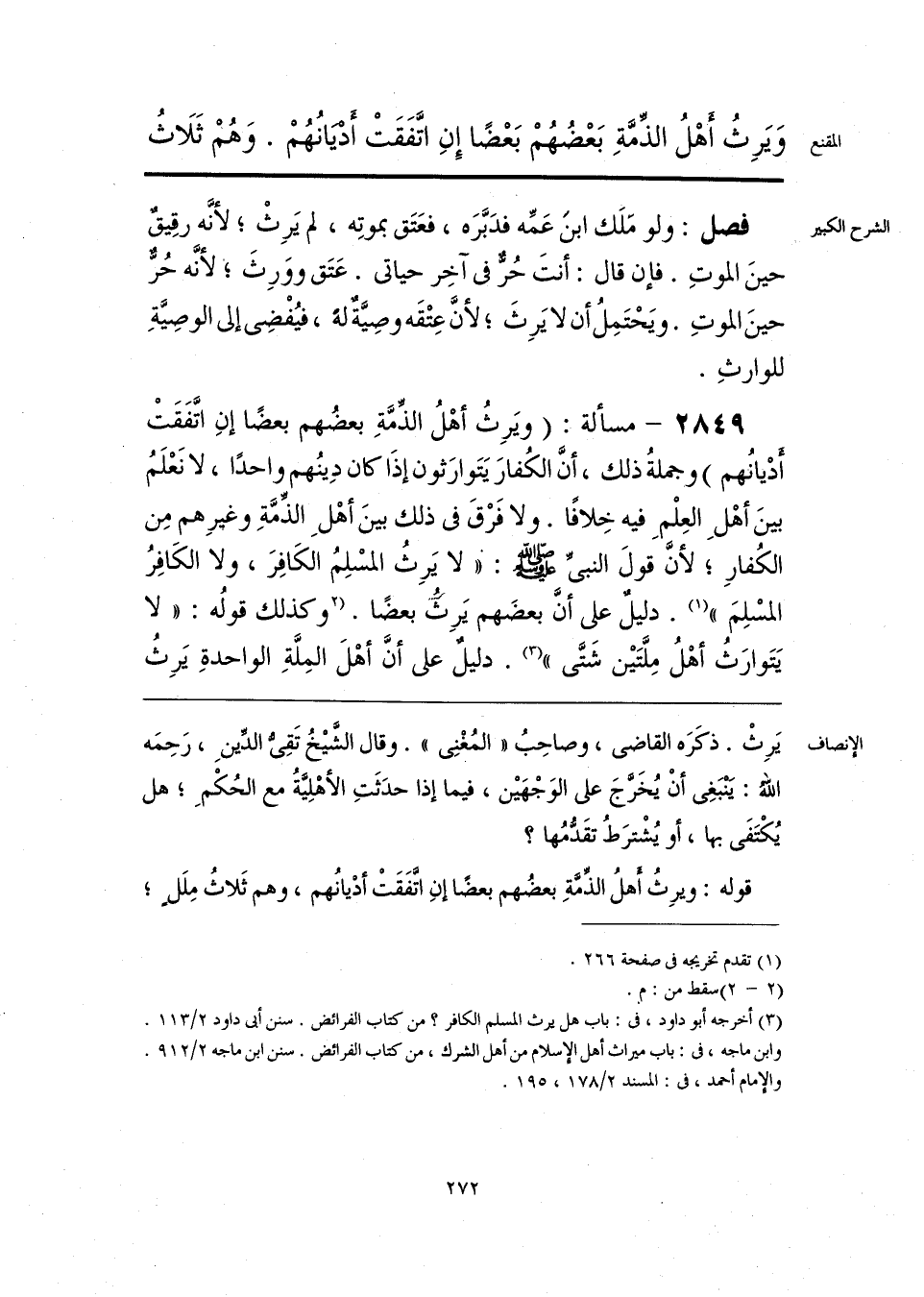 وَيَرِثُ أهْلُ الذِّمَّةِ بَعْضُهُمْ بَعْضًا إِنِ اتَّفَقَتْ أدْيَانُهُمْ. وَهُمْ ثَلَاثُ
