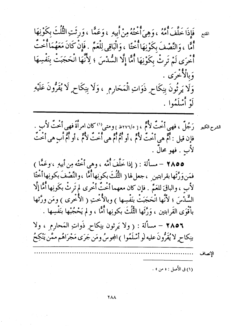 فَإِذَا خَلَّفَ أُمَّهُ، وَهِيَ أُخْتُهُ مِنْ أَبِيهِ، وَعَمًّا، وَرِثَتِ الثُّلُثَ بِكَوْنِهَا أُمًّا، وَالنِّصْفَ بِكَوْنِهَا أُخْتًا، وَالْبَاقِي لِلْعَمِّ. فَإِنْ كَانَ مَعَهُمَا أُخْتٌ أُخْرَى لَمْ تَرِثْ بِكَوْنِهَا أُمًّا إلا السُّدْسَ؛ لِأنَّهَا انْحَجَبَتْ بِنَفْسِهَا وَبِالأُخْرَى.