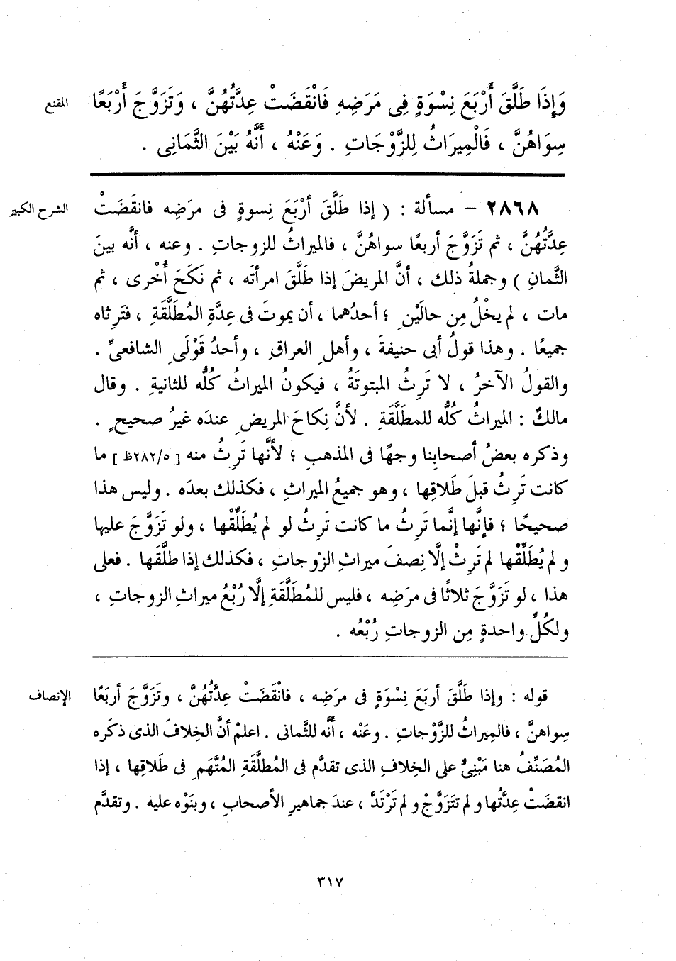 قوله: وإذا طَلَّقَ أربَعَ نِسْوَةٍ في مرَضِه، فانْقَضَتْ عِدَّتُهُنَّ، وتَزَوَّجَ أربَعًا سِواهنَّ، فالمِيراثُ للزوْجاتِ. وعَنْه، أنَّه للثَّماني. اعلمْ أنَّ الخِلافَ الذي ذكَره المُصَنِّفُ هنا مَبْنِيٌّ على الخِلافِ الذي تقدَّم في المُطلَّقَةِ المُتَّهَمِ في طَلاقِها، إذا انقضَتْ عِدَّتُها ولم تتَزَوَّجْ ولم تَرْتَدَّ، عندَ جماهيرِ الأصحابِ، وبنَوْه عليه. وتقدَّم
