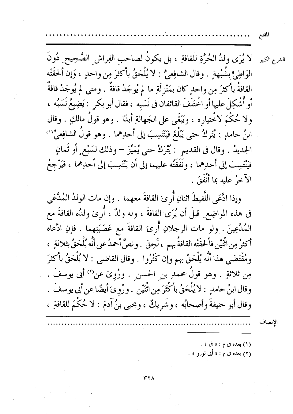 لا يُرَى ولدُ الحُرَّةِ للقافةِ، بل يكونُ لصاحبِ الفِراشِ الصَّحِيحِ دُونَ الوَاطِئِ بشُبْهةٍ. وقال الشافِعيُّ: لا يُلْحَقُ بأكثرَ مِن واحدٍ، وَإن ألحقَتْه القافةُ بأكَثرَ مِن واحدٍ كان بمَنْزِلَةِ ما لم يُوجَدْ قافةٌ. ومتى لم يُوجَدْ قافةٌ أو أُشْكِلَ عليها أو اخْتَلَفَ القائفان في نَسَبِه، فقال أبو بكرٍ: يَضِيعُ نَسَبُه، ولا حُكْمَ لاخْتيارِه، ويَبْقَى على الجَهالةِ أبدًا. وهو قولُ مالكٍ. وقال ابنُ حامدٍ: يُتْركُ حتى يَبْلُغَ فيَنْتَسِبَ إلى أحدِهما. وهو قولُ الشافِعيِّ (¬1) الجديدُ. وقال في القديم: يُتْرَكُ حتى يُمَيِّزَ -وذلك لسَبْعٍ أو ثَمانٍ- فيَنْتَسِبَ إلى أحدِهما، ونفَقَتُه عليهما إلى أن يَنْتَسِبَ إلى أحدِهما، فيَرْجِعُ الآخرُ عليه بما أنْفَقَ.
