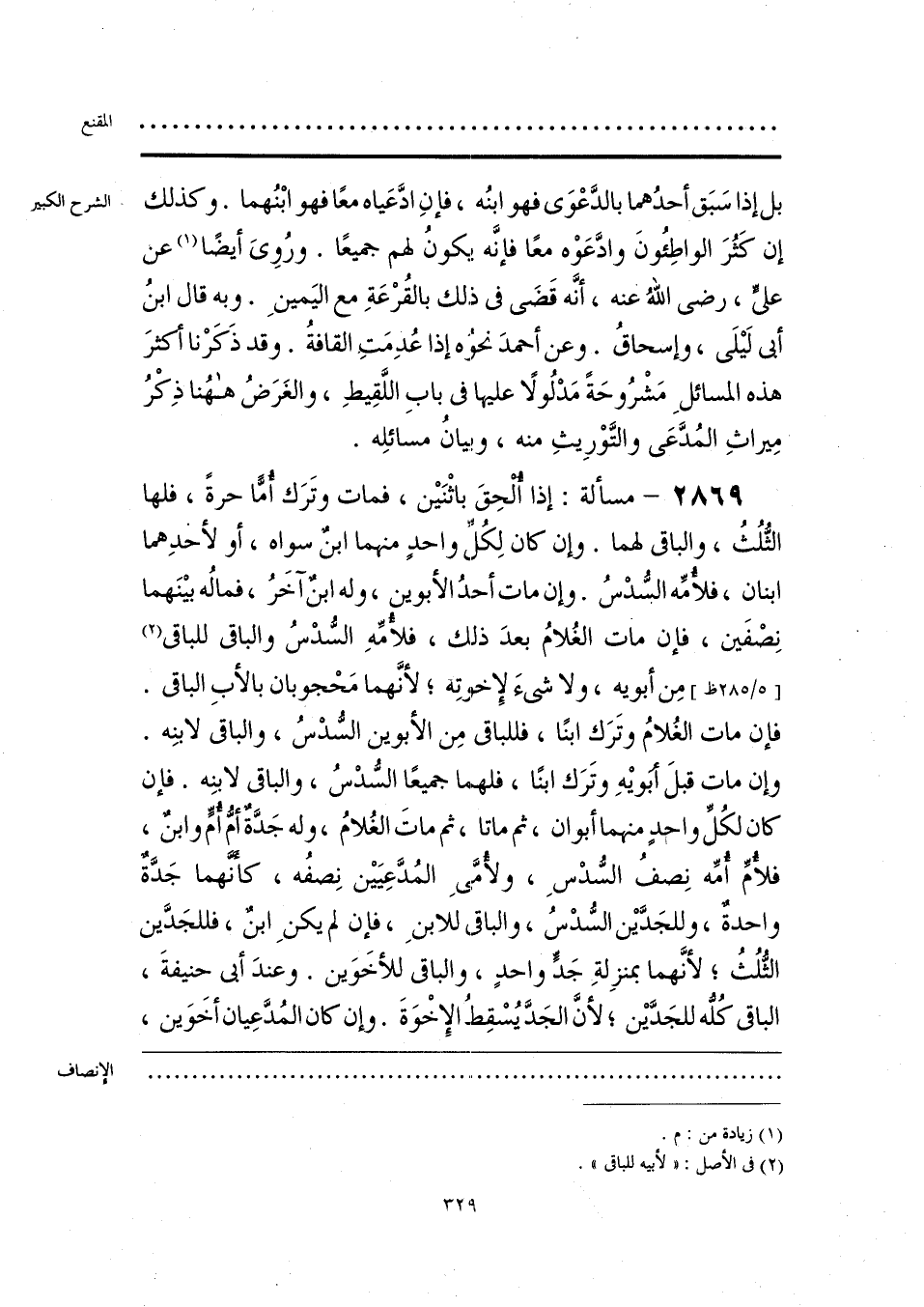 2869 - مسألة: إذا أُلْحِقَ باثْنَين، فمات وتَرَك أُمًّا حرةً، فلها الثُّلُثُ، والباقي لهما. وإن كان لِكُلِّ واحدٍ منهما ابنٌ سواه، أو لأحدِهما ابنان، فلأمِّه السُّدْسُ. وإن مات أحدُ الأبوين، وله ابنٌ آخَرُ، فمالُه بينَهما نِصْفَين، فإن مات الغُلامُ بعدَ ذلك، فلأُمِّهِ السُّدْسُ والباقي للباقي (¬2) مِن أبويه، ولا شيءَ لإِخوتِه؛ لأنَّهما مَحْجوبان بالأبِ الباقي. فإن مات الغُلامُ وتَرَك ابنًا، فللباقي مِن الأبوين السُّدْسُ، والباقي لابنِه. وإن مات قبلَ أبَويهِ وتَرَك ابنًا، فلهما جميعًا السُّدْسُ، والباقي لابنِه. فإن كان لكُلِّ واحدٍ منهما أبوان، ثم ماتا، ثم ماتَ الغُلامُ، وله جَدَّةٌ أمُّ أُمٍّ وابنٌ، فلأُمِّ أُمِّه نِصفُ السُّدْسِ، ولأُمِّي المُدَّعِيَين نِصفُه، كأنَّهما جَدَّةٌ واحدةٌ، وللجَدَّين السُّدْسُ، والباقي للابنِ، فإن لم يكنِ ابنٌ، فللجَدَّين الثُّلُثُ؛ لأنَّهما بمنزِلةِ جَدٍّ واحدٍ، والباقي للأخَوَين. وعندَ أبي حنيفةَ، الباقي كُلُّه للجَدَّين؛ لأنَّ الجَدَّ يُسْقِطُ الإِخْوَةَ. وإن كان المُدَّعِيان أخَوَين،
