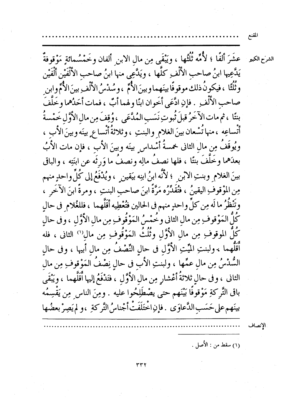 عشَرَ ألفًا؛ لأُمِّه ثُلُثُها، ويَبْقَى مِن مالِ الابن ألفان وخَمْسُمائةٍ مَوْقوفةٌ يَدَّعِيها ابنُ صاحبِ الألْفِ كلَّها، ويَدَّعِي منها ابنُ صاحبِ الألْفَين ألْفَين وثُلُثًا، فيكونُ ذلك موقوفًا بينَهما وبينَ الأُمِّ، وسُدْسُ الألْفِ بينَ الأُمِّ وابنِ صاحبِ الألْفِ. فإنِ ادَّعَى أخَوان ابنًا ولهما أبٌ، فمات أحَدُهما وخَلَّفَ بنتًا، ثم مات الآخَرُ قبلَ ثُبوتِ نَسَبِ المُدَّعَى، وُقِفَ مِن مالِ الأوَّلِ خَمْسةُ أتْساعِه، منها تُسْعان بينَ الغلامِ والبنتِ، وثلاثةُ أتْساعٍ بينَه وبينَ الأب، ويُوقَفُ مِن مالِ الثاني خمسةُ أسْداس بينَه وبينَ الأبِ، فإن مات الأَبُ بعدَهما وخَلَّفَ بنتًا، فلها نصفُ مالِه ونصف ما وَرِثَه عن ابنَتِه، والباقي بينَ الغلامِ وبنتِ الابنِ؛ لأنَّه ابنُ ابنِه بيَقينٍ، ويُدْفَعُ إلى كُلِّ واحدٍ منهم مِن الموْقوفِ اليقينُ، فتُقَدِّرُه مَرَّةً ابنَ صاحبِ البنتِ، ومرةً ابنَ الآخرِ، وتَنْظُرُ ما لَه مِن كلِّ واحدٍ منهم في الحالين فتُعْطِيه أقَلَّهما، فللغُلامِ في حالٍ كُلُّ المَوْقوفِ مِن مالِ الثاني وخُمْسُ المَوْقُوفِ مِن مالِ الأوَّلِ، وفي حالٍ كُلُّ الموقوفِ مِن مالِ الأوَّلِ وثُلُثُ المَوْقوفِ مِن مالِ (¬1) الثاني، فله أُقلُّهما، ولبنتِ الميِّتِ الأوَّلِ في حالٍ النِّصْفُ مِن مالِ أبيها، وفي حالٍ السُّدْسُ مِن مالِ عمِّها، ولبنتِ الأبِ في حالٍ نِصْفُ المَوْقوفِ مِن مالِ الثاني، وفي حالٍ ثلاثةُ أعْشارٍ مِن مالِ الأولِ، فتَدْفَعُ إليها أقَلَّهما، ويَبْقَى باقي التَّرِكةِ مَوْقوفًا بَينَهم حتى يصْطَلِحُوا عليه. ومِنَ الناسِ مِن يَقْسِمُه بينَهم على حَسَبِ الدَّعاوَى. فإنِ اخْتَلَفَتْ أجْناسُ التَّركةِ، ولم يَصِرْ بعضُها