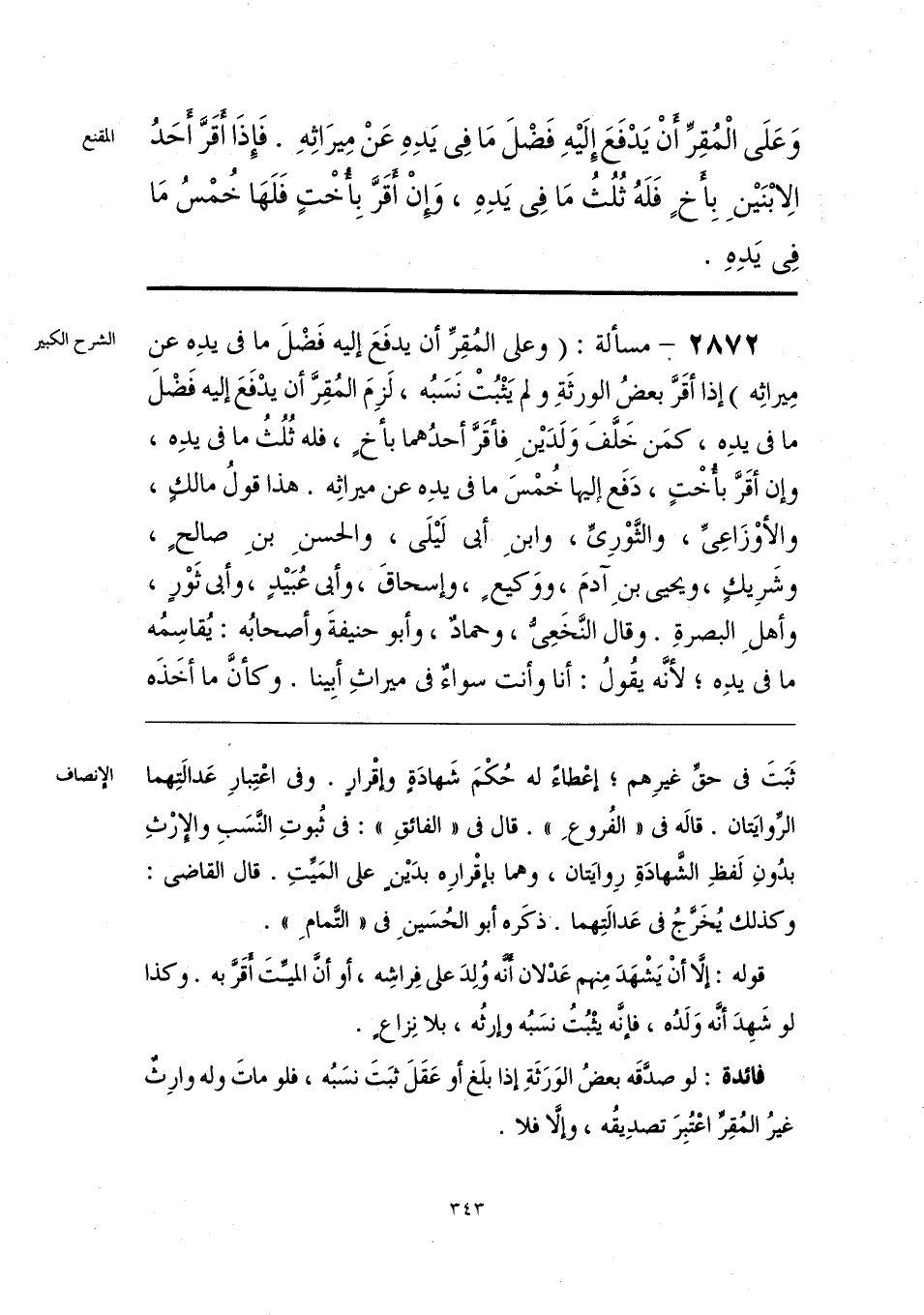 وَعَلَى الْمُقِرِّ أنْ يَدْفَعَ إِلَيهِ فَضْلَ مَا في يَدِهِ عَنْ مِيرَاثِهِ. فَإِذَا أقَرَّ أَحَدُ الابْنَينِ بِأَخٍ فَلَهُ ثُلُثُ مَا في يَدِهِ، وَإنْ أقَرَّ بِأُخْتٍ فَلَهَا خُمْسُ مَا في يَدِهِ.