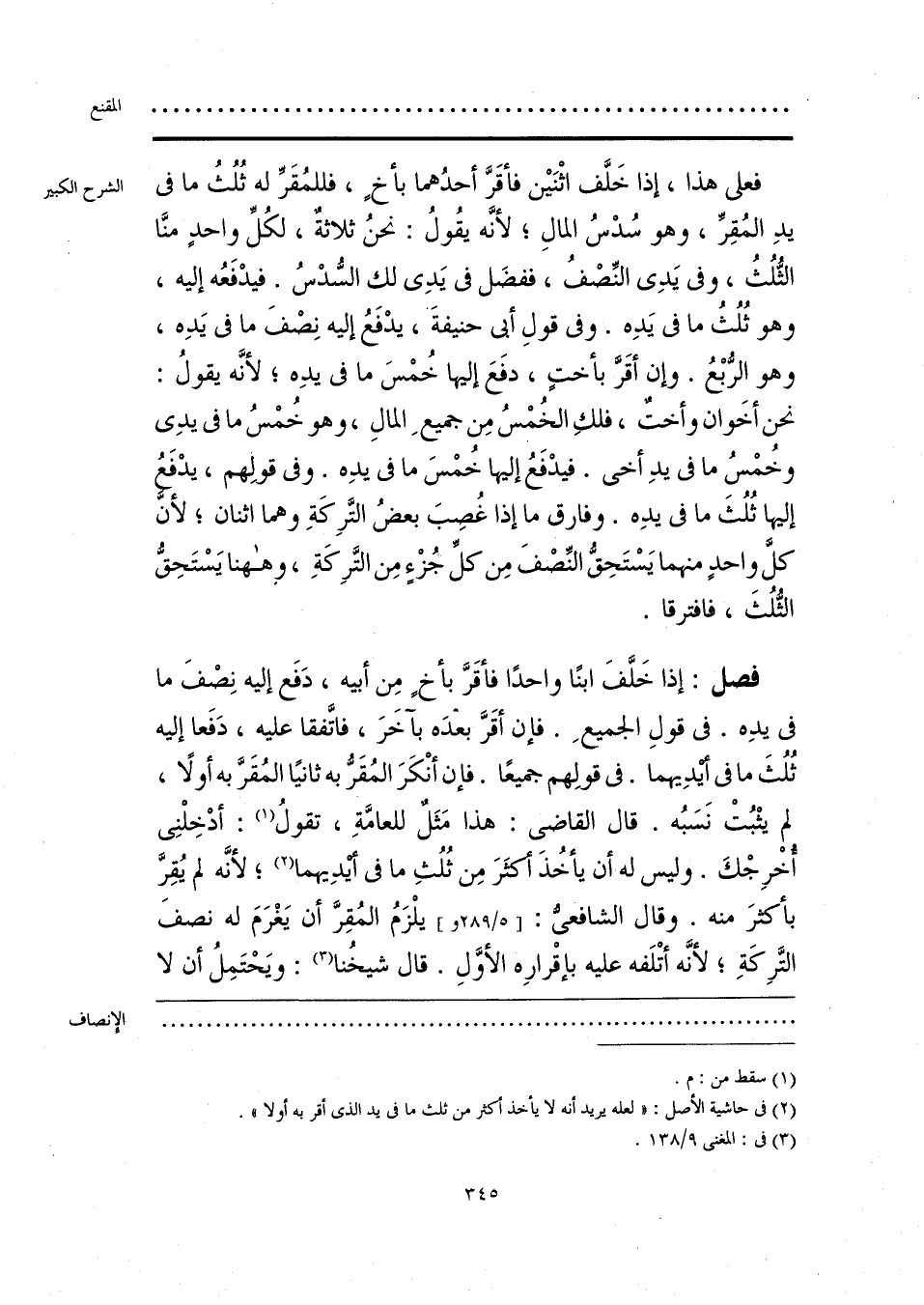 فصل: إذا خَلَّفَ ابنًا واحدًا فأقَرَّ بأخٍ مِن أبيه، دَفَع إليه نِصْفَ ما في يدِه. في قولِ الجميعِ. فإن أقَرَّ بعدَه بآخَرَ، فاتَّفقا عليه، دَفَعا إليه ثُلُثَ ما في أيدِيهما. في قولِهم جميعًا. فإن أنْكَرَ المُقَرُّ به ثانيًا المُقَرَّ به أولًا، لم يثْبُتْ نَسَبُه. قال القاضي: هذا مَثَلٌ للعامَّةِ، تقولُ (¬1): أدْخِلْنِي أُخْرِجْكَ. وليس له أن يأخُذَ أكثَرَ مِن ثُلُثِ ما في أيدِيهما (¬2)؛ لأنَّه لم يُقِرَّ بأكثرَ منه. وقال الشافعيُّ: يلْزَمُ المُقِرَّ أن يَغْرَمَ له نصف التَّرِكَةِ؛ لأنَّه أتْلَفه عليه بإقْرارِه الأوَّلِ. قال شيخُنا (¬3): ويَحْتَمِلُ أن لا