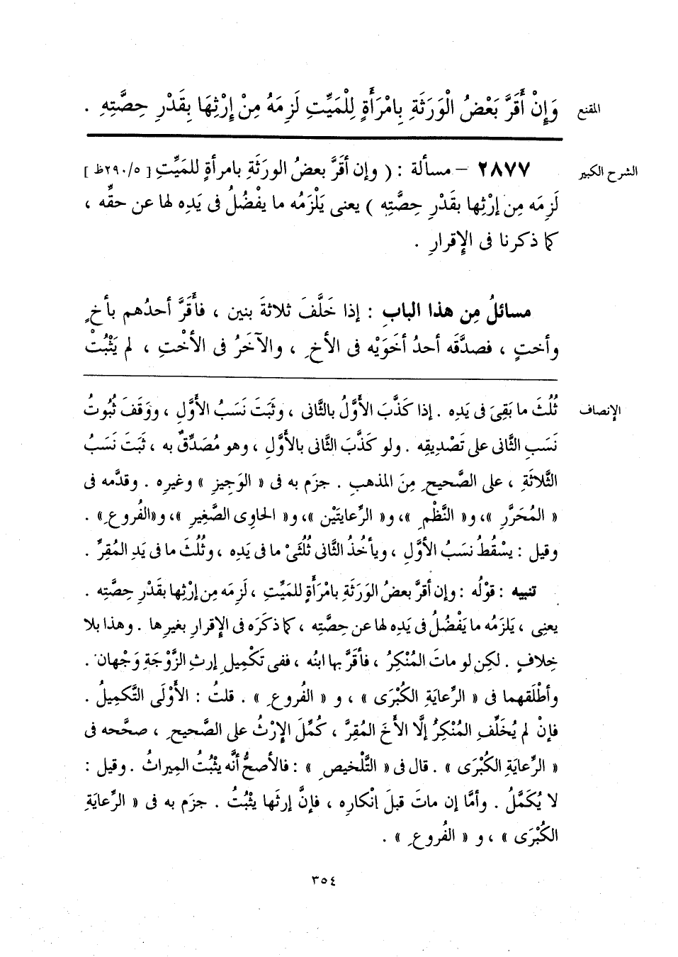 تنبيه: قوْلُه: وإن أقرَّ بعضُ الوَرَثَةِ بامْرَأةٍ للمَيِّتِ، لَزِمَه مِن إرْثها بقَدْرِ حِصَّتِه. يعنِي، يَلزَمُه ما يَفْضُلُ في يَدِه لها عن حِصَّتِه، كما ذكَرَه في الإقرارِ بغيرِها. وهذا بلا خِلافٍ. لكِن لو ماتَ المُنْكِرُ، فأقَر بها ابنُه، ففي تَكْمِيلِ إرثِ الزوْجَةِ وَجْهان. وأطْلَقهما في «الرِّعايَةِ الكُبْرَى»، و «الفُروعِ». قلتُ: الأوْلَى التَكمِيلُ. فإنْ لم يُخَلِّفِ المُنْكِر إلَّا الأخَ المُقِرّ، كُمِّلَ الإرْثُ على الصَّحيحِ، صحَّحه في «الرِّعايَةِ الكُبْرَى» قال في «التلْخيصِ»: فالأصحُّ أنه يثْبُتُ المِيراثُ. وقيل: لا يُكَمَّلُ. وأمَّا إن ماتَ قبلَ إنْكارِه، فإن إرثَها يثْبُتُ. جزَم به في «الرعايَةِ الكُبْرَى»، و «الفُروعِ».