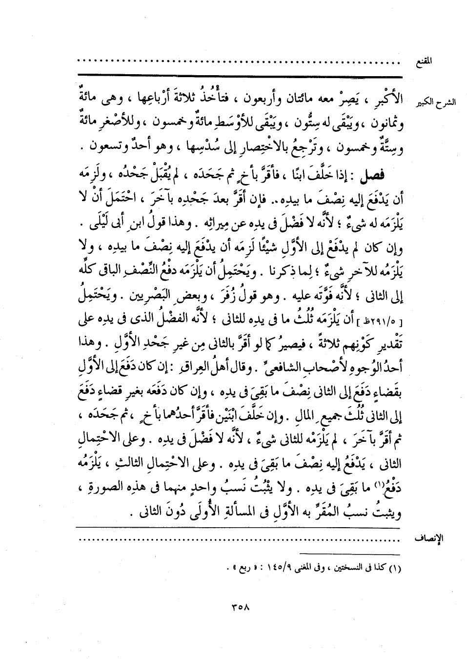 فصل: إذا خَلَّفَ ابنًا، فأقَرَّ بأخٍ ثم جَحَدَه، لم يُقْبَلْ جَحْدُه، ولَزِمَه أن يَدْفَعَ إليه نِصْفَ ما بيدِه. فإن أقَرَّ بعدَ جَحْدِه بآخَرَ، احْتَمَلَ أنْ لا يَلْزَمَه له شيءٌ؛ لأنَّه لا فَضْلَ في يدِه عن ميِراثِه. وهذا قولُ ابنِ أبي لَيلَى. وإن كان لم يدْفَعْ إلى الأوَّلِ شيئًا لَزِمَه أن يدْفَعَ إليه نِصْفَ ما بيدِه، ولا يَلْزَمُه للآخرِ شيءٌ؛ لِما ذكرنا. ويَحْتَمِلُ أن يَلْزَمَه دفْعُ النِّصْفِ الباقي كلِّه إلى الثاني؛ لأنَّه فوَّتَه عليه. وهو قولُ زُفَرَ، وبعضِ البَصْرِيين. ويَحْتَمِلُ أن يَلْزَمَه ثُلُثُ ما في يدِه للثاني؛ لأنَّه الفضْلُ الذي في يدِه على تَقْديرِ كَوْنِهم ثلاثةً، فيصيرُ كما لو أقَرَّ بالثاني مِن غيرِ جَحْدِ الأوَّلِ. وهذا أحدُ الوُجوهِ لأصْحابِ الشافعيِّ. وقال أهلُ العِراقِ: إن كان دَفَعَ إلى الأوَّلِ بقَضاءٍ دَفَعَ إلى الثاني نِصْفَ ما بَقِيَ في يدِه، وإن كان دَفَعَه بغيرِ قضاءٍ دَفَعَ إلى الثاني ثُلُثَ جميعِ المالِ. وإن خَلَّفَ ابْنَين فأقَرَّ أحدُهما بأخٍ، ثم جَحَدَه، ثم أقَرَّ بآخَرَ، لم يَلزَمْه للثاني شيءٌ؛ لأنَّه لا فَضْلَ في يدِه. وعلى الاحْتِمالِ الثاني، يَدْفَعُ إليه نِصْفَ ما بَقِيَ في يدِه. وعلى الاحْتِمالِ الثالثِ، يَلْزَمُه دَفْعُ (¬1) ما بَقِيَ في يدِه. ولا يثْبُتُ نَسبُ واحدٍ منهما في هذِه الصورةِ، ويثبتُ نسبُ المُقَرِّ به الأوَّلِ في المسألةِ الأولَى دُونَ الثاني.