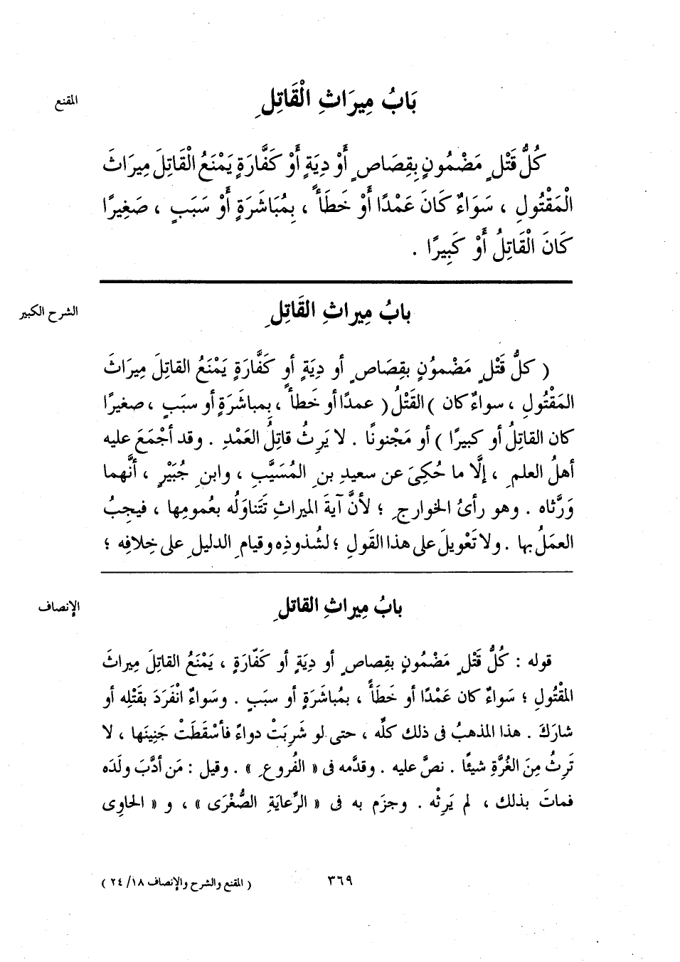 قوله: كُلُّ قَتْلٍ مَضْمُونٍ بقِصاصٍ أو دِيَةٍ أو كَفَّارَةٍ، يَمْنَعُ القاتِلَ مِيراثَ المقْتُولِ؛ سَواءٌ كان عَمْدًا أو خَطَأً، بمُباشَرَةٍ أو سبَبٍ. وسَواءٌ انْفَرَدَ بقَتْلِه أو شارَكَ. هذا المذهبُ في ذلك كله، حتى لو شَرِبَتْ دواءً فأسْقَطَتْ جَنِينَها، لا تَرِثُ مِنَ الغُرَّةِ شيئًا. نصَّ عليه. وقدَّمه في «الفُروعِ». وقيل: مَن أدَّبَ ولَدَه فماتَ بذلك، لم يَرِثْه. وجزَم به في «الرِّعايَةِ الصغْرَى»، و «الحاوي
