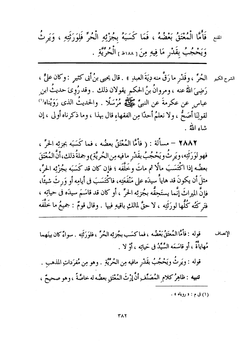 قوله: ويَرِثُ ويَحْجُبُ بقَدْرِ ما فيه مِن الحُريَّةِ. وهو مِن مُفرَداتِ المذهبِ.