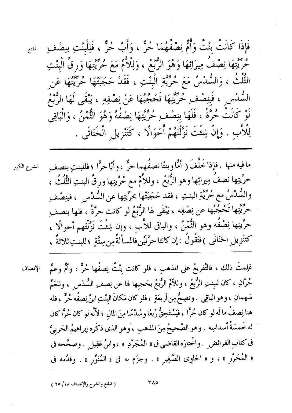 فَإِذَا كَانَتْ بِنْتٌ وَأمٌّ نِصْفُهُما حُرٌّ، وَأَبٌ حُرٌّ، فَلِلْبِنْتِ بنِصْفِ حُرِّيَّتِهَا نِصْفُ مِيرَاثِهَا وَهُوَ الرُّبْعُ، وَلِلأمِّ مَعَ حُرِّيَّتِهَا وَرِقِّ الْبِنْتِ الثُّلُثُ، وَالسُّدْسُ مَعَ حُرِّيَّةِ الْبِنْتِ، فَقَدْ حَجَبَتْهَا حُرِّيّتهَا عَنِ السُّدْسِ، فَبِنِصْفِ حُرِّيَّتِهَا تَحْجُبُهَا عَنْ نِصْفِهِ، يَبْقَى لَهَا الرُّبْعُ لَوْ كَانَتْ حُرَّةً، فَلَهَا بِنِصْفِ حُرِّيَّتِهَا نِصْفُهُ وهُوَ الثُّمْنُ، وَالْبَاقِي لِلْأَبِ. وَإنْ شِئْتَ نَزَّلْتَهُمْ أَحْوَالًا، كَتَنْزِيلِ الْخَنَاثَى.