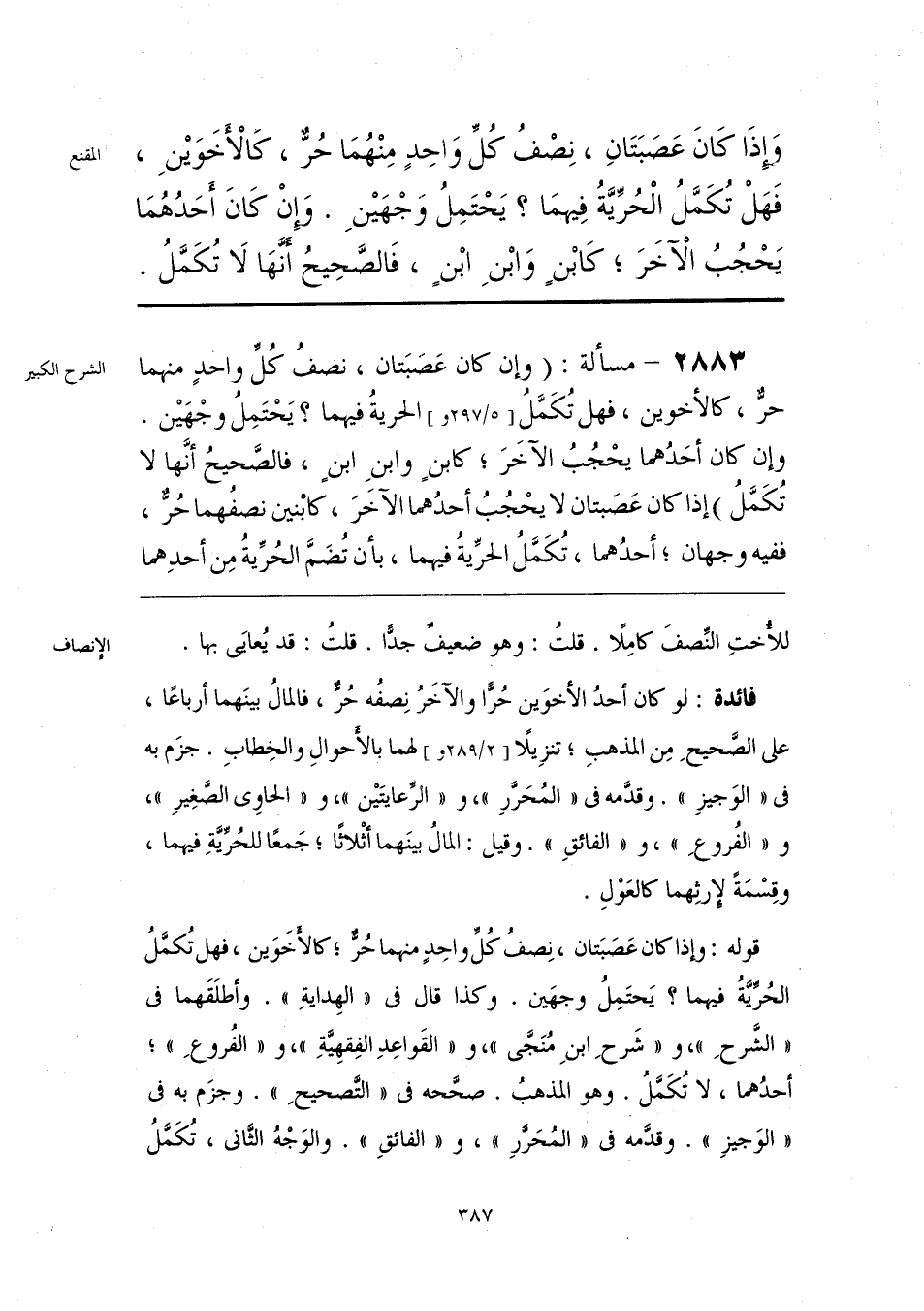 فائدة: لو كان أحدُ الأخوَين حُرًّا والآخَر نِصفُه حُر، فالمالُ بينَهما أرباعًا، على الصَّحيحِ مِن المذهبِ؛ تنزِيلًا لهما بالأحوالِ والخِطابِ. جزَم به في «الوَجيزِ». وقدَّمه في «المُحَرَّرِ»، و «الرِّعايتَين»، و «الحاوي الصَّغِيرِ»، و «الفُروعِ»، و «الفائقِ». وقيل: المالُ بينَهما أثْلاثًا؛ جَمعًا للحُريَّةِ فيهما، وقِسْمَةً لإرثِهما كالعَوْلِ.