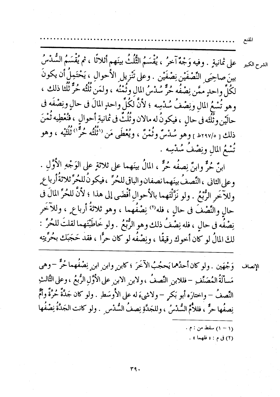 وَجْهَين. ولو كان أحدُهما يَحجُبُ الآخَرَ؛ كابنٍ وابنِ ابنٍ نِصْفُهما حُرٌّ -وهي مَسألَةُ المُصَنِّفِ- فللابنِ النِّصفُ، ولابنِ الابنِ على الأوَّلِ الرُّبعُ، وعلى الثَّالثِ النِّصفُ -واختارَه أبو بَكرٍ- ولا شيءَ له على الأوسَطِ. ولو كان جَدَّةٌ حُرَّةٌ وأُمٌّ نِصفُها حرٌّ، فللأمِّ السُّدْسُ، وللجَدَّةِ نِصفُ السُّدْسِ. ولو كانت الجَدَّةُ نِصْفُها