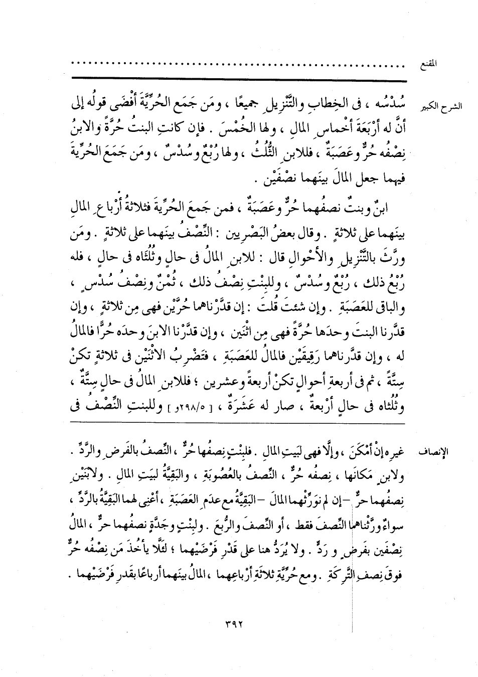 غيرِه إنْ أمْكَن، وإلَّا فهي لبَيتِ المالِ. فلبِنْتٍ نِصفُها حُرٌّ، النِّصفُ بالفَرضِ والرَّدِّ. ولابنٍ مَكانَها، نِصفُه حُر، النِّصفُ بالعُصُوبَةِ، والبَقِيَّةُ لبيَتِ المالِ. ولابنَينِ نِصفُهما حر -إن لم نوَرِّثْهما المال- البَقِيَّةُ مع عدَمِ العَصَبَةِ، أعْنِي لهما البَقِيَّةُ بالرَّدِّ، سواءٌ ورثْناهما النِّصفَ فقط، أو النِّصفَ والرُّبعَ. ولبِنْتٍ وجَدَّةٍ نصفُهما حرٌّ، المالُ نِصْفَين بفَرضٍ ورَدٌّ. ولا يُرَدُّ هنا على قَدْرِ فَرْضَيهما؛ لئَلَّا يأخُذَ مَن نِصْفُه حُر فوقَ نِصفِ التَّرِكَةِ. ومع حُرِّيَّةِ ثلاثةِ أرْباعِهما، المالُ بينَهما أرباعًا. بقَدرِ فَرْضَيهما.
