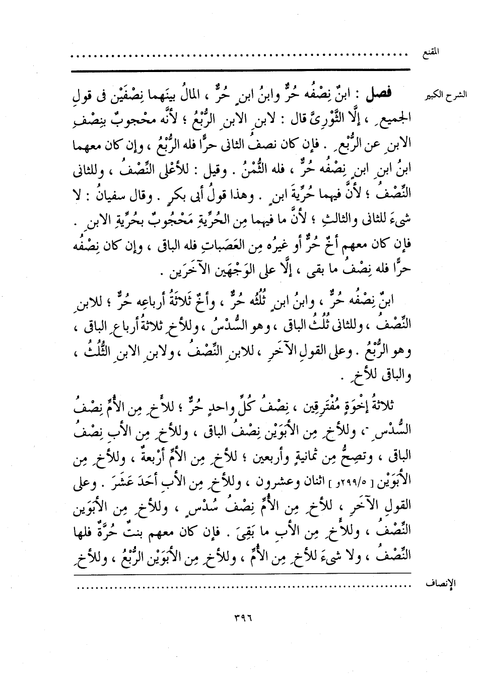 فصل: ابنٌ نِصْفُه حُرٌّ وابنُ ابن حُر، المالُ بينَهما نِصْفَين في قولِ الجميعِ، إلَّا الثَّوْرِيَّ قال: لابنِ الابنِ الرُّبْعُ؛ لأنَّه محْجوبٌ بنِصْف الابنِ عن الرُّبْعِ. فإن كان نصفُ الثاني حرًّا فله الرُّبْعُ، وإن كان معهما ابنُ ابنِ ابنٍ نِصْفُه حُرٌّ، فله الثُّمْنُ. وقيل: للأعْلى النِّصْف، وللثاني النِّصْفُ؛ لأنَّ فيهما حُرِّيةَ ابن. وهذا قولُ أبي بكرٍ. وقال سفيانُ: لا شيءَ للثاني والثالثِ؛ لأنَّ ما فيهما مِن الحُريةِ مَحْجُوب بحُريةِ الابنِ. فإن كان معهم أخ حُر أو غيرُه مِن العَصَباتِ فله الباقي، وإن كان نِصْفُه حرًّا فله نِصْفُ ما بقى، إلَّا على الوَجْهَين الآخَرَين.