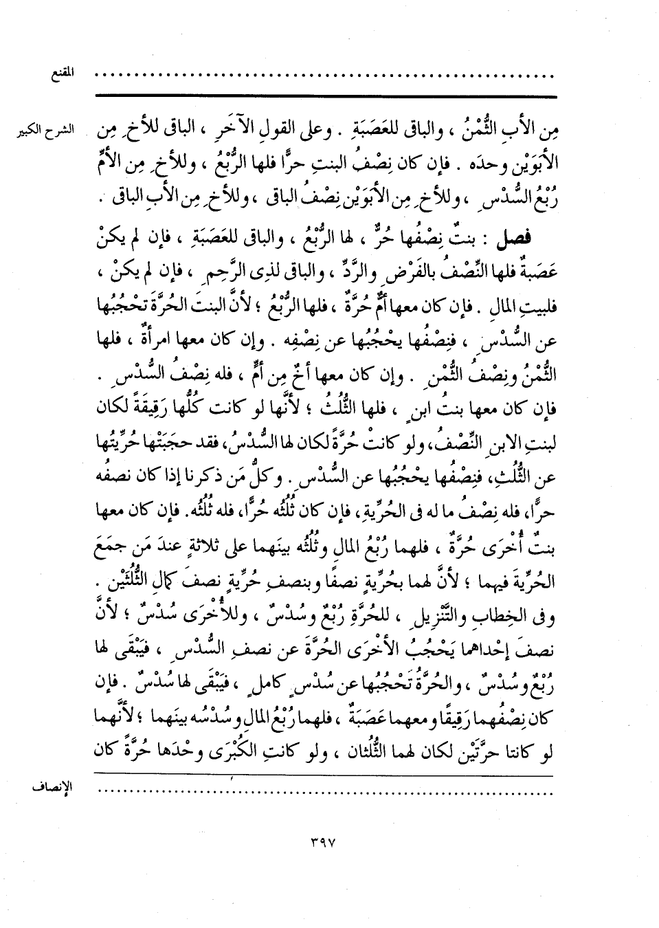 فصل: بنتٌ نِصْفُها حُرٌّ، لها الرُّبْعُ، والباقي للعَصَبَةِ، فإن لم يكنْ عَصَبةٌ فلها النصْفُ بالفَرْضِ والرَّدِّ، والباقي لذِي الرَّحِمِ، فإن لم يكنْ، فلبيتِ المالِ. فإن كان معها أمٌّ حُرَّةٌ، فلها الرُّبْعُ، لأنَّ البنتَ الحُرَّةَ تحْجُبُها عن السُّدْسِ، فنِصْفُها يحْجُبُها عن نِصْفِه. وإن كان معها امرأة، فلها الثُّمْنُ ونِصْفُ الثُّمْنِ. وإن كان معها أخٌ مِن أمٍّ، فله نِصْفُ السُّدْسِ. فإن كان معها بنتُ ابنٍ، فلها الثُّلُثُ، لأنَّها لو كانت كُلُّها رَقِيقَةً لكان لبنتِ الابنِ النِّصْفُ، ولو كانت حُرَّةً لكان لها السُّدْسُ، فقد حجَبَتْها حُرِّيتُها عن الثُّلُثِ، فنِصْفُها يحْجُبُها عن السُّدْسِ. وكلُّ مَن ذكرنا إذا كان نصفه حرًّا، فله نِصْفُ ما له في الحُرِّيةِ، فإن كان ثُلُثُه حُرًّا، فله ثُلُثُه. فإن كان معها بنتٌ أخْرَى حُرَّةٌ، فلهما رُبْعُ المالِ وثُلُثُه بينَهما على ثلاثةٍ عندَ مَن جمَعَ الحُرّيةَ فيهما؛ لأنَّ لهما بحُرِّيةٍ نصفًا وبنصفِ حُرِّيةٍ نصف كمالِ الثُّلُثَين. وفي الخِطابِ والتنزِيلِ، للحُرَّةِ رُبْعٌ وسُدْسٌ، وللأخْرَى سُدْسٌ، لأنَّ نصفَ إحْداهما يَحْجُبُ الأخْرَى الحُرَّةَ عن نصفِ السُّدْسِ، فيَبْقَى لها رُبْعٌ وسُدْسٌ، والحُرَّةُ تحْجُبُها عن سُدْس كامل، فيَبْقَى لها سُدْسٌ. فإن كان نِصْفُهما رَقِيقًا ومعهما عَصَبَةٌ، فلهما رُبْعُ المالِ وسُدْسُه بينَهما؛ لأنَّهما لو كانتا حرَّتَين لكان لهما الثُّلُثان، ولو كانتِ الكُبْرَى وحْدَها حُرَّةً كان
