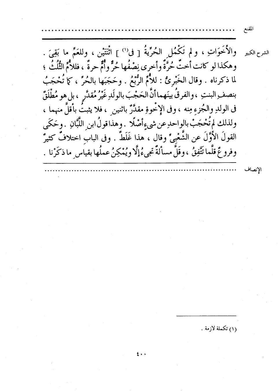 والأخَوَاتِ، ولم تَكْمُلِ الحُرِّيةُ [في (¬1)] اثْنَتَين، وللعَمِّ ما بَقِيَ. وهكذا لو كانت أختٌ حُرَّةٌ وأخرى نِصْفُها حُرٌّ وأمٌ حرةٌ، فللأمِّ الثُّلُثُ؛ لما ذكرناه. وقال الخَبْرِيُّ: للأمِّ الرُّبْعُ. وحَجَبَها بالحُرِّ، كما تُحْجَبُ بنصفِ البنتِ، والفرقُ بينَهما أنَّ الحَجْبَ بالولَدِ غَيرُ مُقدَّرٍ، بل هو مُطْلَقٌ في الولدِ والجُزءِ مِنه، وفي الإِخْوةِ مقدَّرٌ باثنينِ، فلا يثبتُ بأقلَّ منهما، ولذلك لم تُحْجَبْ بالواحدِ عن شيءٍ أصْلًا. وهذا قولُ ابنِ اللبَّانِ. وحَكَى القولَ الأوَّلَ عن الشَّعْبِيِّ وقال، هذا غَلَطٌ. وفي البابِ اختلاف كثيرٌ وفروعٌ قلَّما تَتَّفِقُ، وقَلَّ مسألة تجئُ إلَّا ويُمْكِنُ عملُها بقياسِ ما ذكَرْنا.