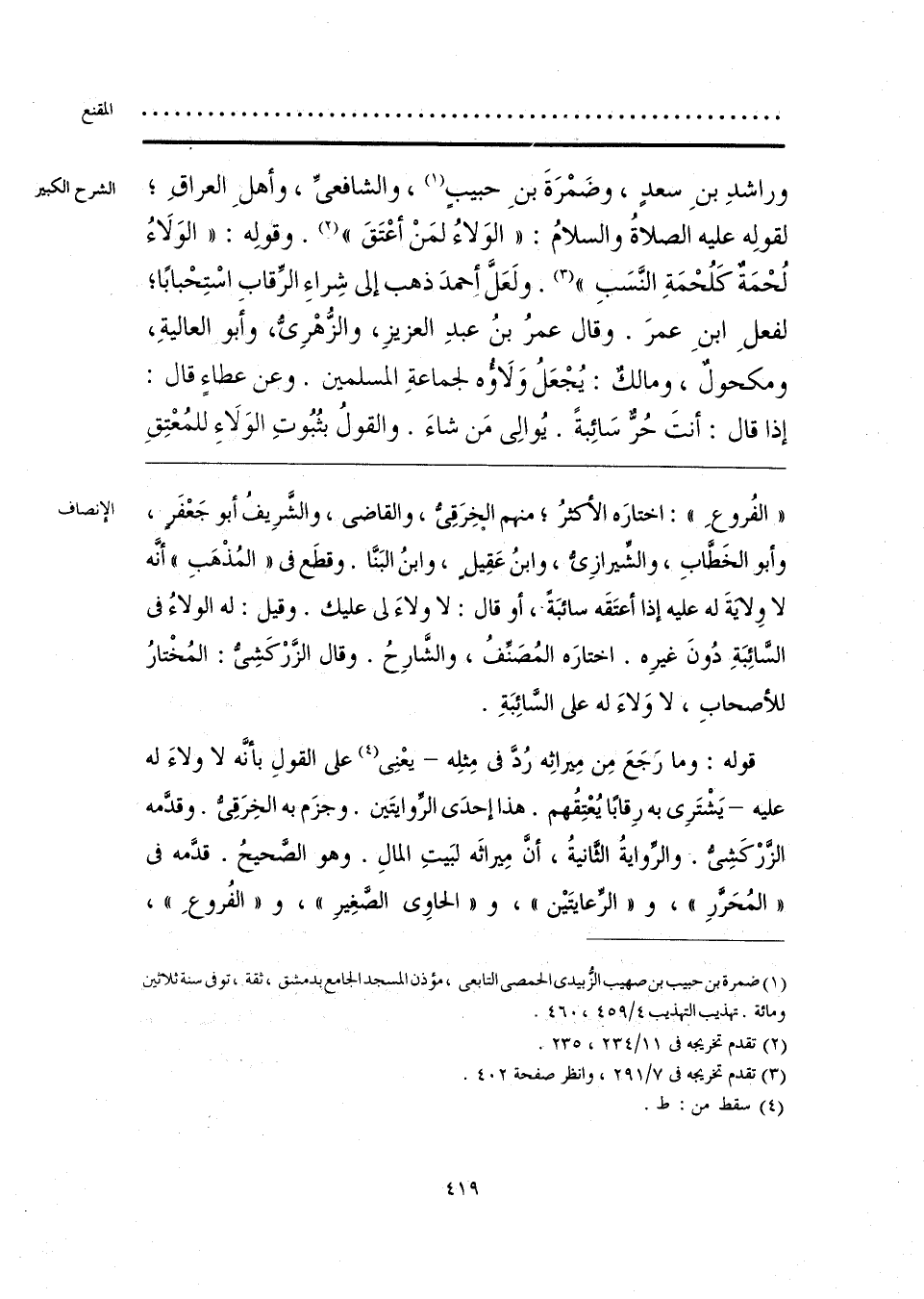 «الفُروع»: اختاره أكثرُ؛ منهم الخرَقِي، والقاضي، والشَّرِيفُ أبو جعفَر، وأبو الخَطَّابِ، والشِّيرازِيُّ، وابنُ عَقِيل، وابنُ البَنَّا. وقطَع في «المُذْهبِ» أنَّه لا ولايةَ له عليه إذا أعتَقَه سائبَةً، أو قال: لا ولاءَ لي عليك. وقيل: له الولاءُ في السائِبَةِ دُونَ غيرِه. اختارَه المُصَنِّفُ، والشَّارِحُ. وقال الزركَشِيُّ: المُخْتارُ للأصحابِ، لا وَلاءَ له على السائِبَةِ.
