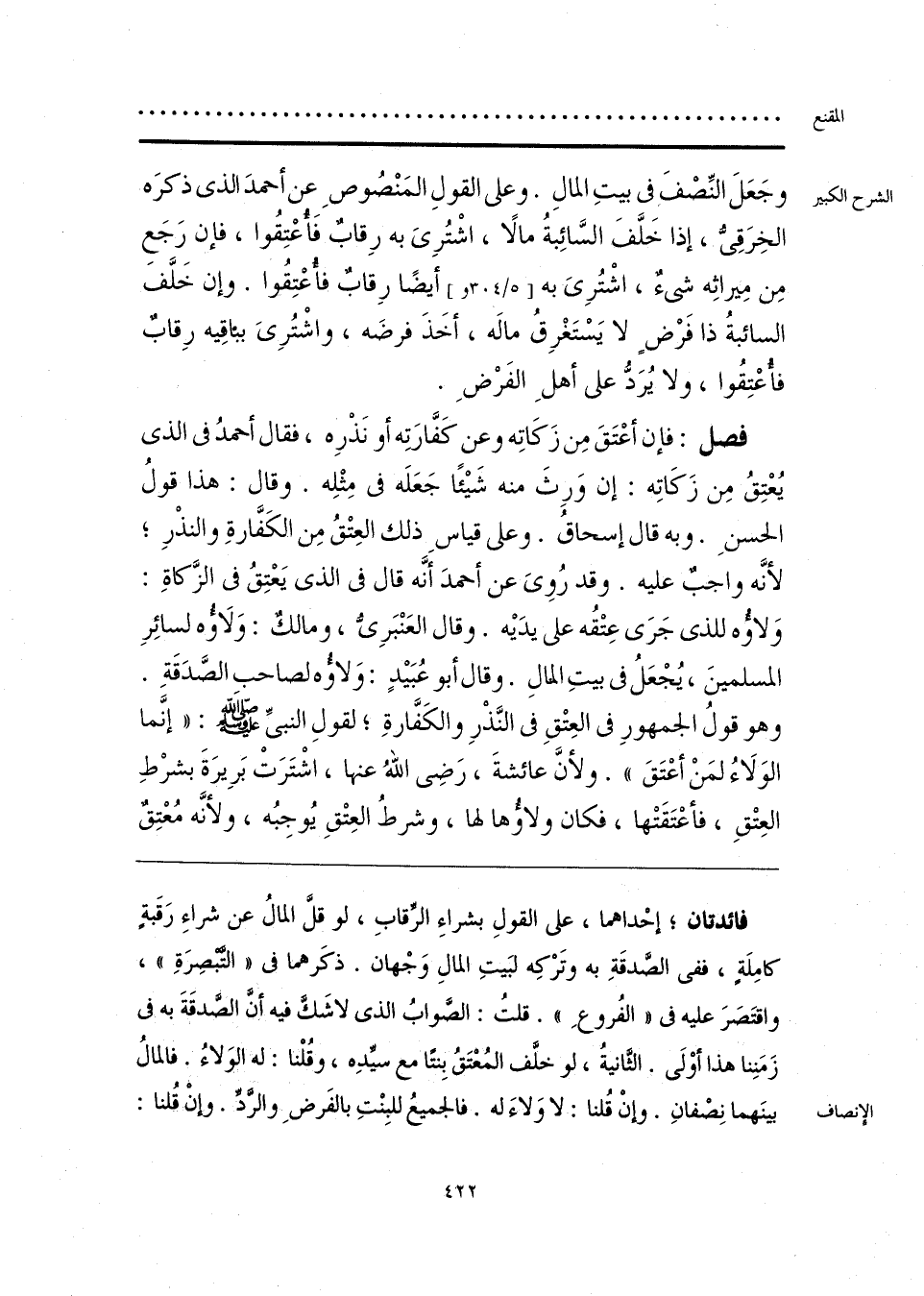 فائدتان؛ إحداهما، على القولِ بشراءِ الرِّقابِ، لو قلَّ المالُ عن شراءِ رَقَبةٍ كامِلَةٍ، ففي الصَّدقَةِ به وتَركِه لبَيتِ المالِ وَجْهان. ذكَرهما في «التبصِرَةِ»، واقتَصَرَ عليه في «الفُروعِ». قلتُ: الصَّوابُ الذي لا شَكَّ فيه أنَّ الصَّدقَةَ به في زَمَنِنا هذا أوْلَى. الثَّانيةُ، لو خلَّف المُعتَقُ بِنتًا مع سيِّدِه، وقُلْنا: له الوَلاءُ فالمالُ بينَهما نصفانِ. وإنْ قُلنا: لا وَلاءَ له. فالجميعُ للبِنْتِ بالفَرضِ والردِّ. وإنْ قُلنا: