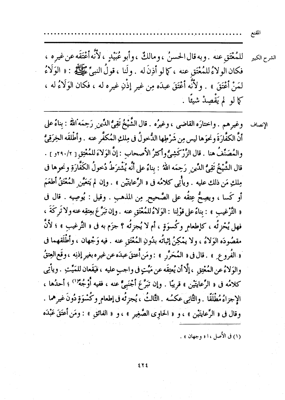 وغيرِهم. واختارَه القاضي، وغيرُه. قال الشَّيخُ تَقِي الدِّينِ رَحِمَه الله: بِناءً على أن الكفَّارَةَ ونحوَها ليس مِن شَرطِها الدُّخولُ في مِلكِ المُكفرِ عنه. وأطْلقَه الخِرَقِيُّ والمُصَنفُ هنا. قال الزَّركَشِيُّ وأكثرُ الأصحابِ: إنَّ الوَلاءَ للمُعتِقِ. قال الشيخُ تَقِي الدِّينِ رَحِمَه الله: بِناءً على أنه يُشترَطُ دُخولُ الكَفارَةِ ونحوها في مِلك مَن ذلك عليه. ويأتِي كلامُه في «الرِّعايتَين». كان لم يَتعَيَّنِ المُعتَقُ أطعَمَ أو كَسا، ويصِحُّ عِتقُه على الصَّحيحِ مِن المذهبِ. وقيل: يُوصِيه. قال في «الترغيبِ»: بِناءً على قوْلنا: الوَلاءُ للمُعتَقِ عنه. كان تبَرَّعَ بعِتقِه عنه ولا تَرِكَةَ، فهل يُجْزِئُه، كإطعام وكُسوَةٍ، أم لا يُجزِئُه؟ جزَم به في «التَّرغيبِ»؛ لأن مقصُودَه الوَلاءُ، ولا يمكِنُ إثباتُه بدُونِ المعتَقِ عنه. فيه وَجْهان، وأطْلَقهما في «الفُروعِ». قال في «المُحَررِ»: ومَن أعتقَ عبدَه عن غيرِه بغيرِ إذنِه، وقَع العِتقُ والوَلاءُ عن المُعتِقِ، إلَّا أن يُعتِقَه عن مَيِّتٍ في واجب عليه، فيَقَعان للمَيِّتِ. ويأتِي كلامُه في «الرِّعايتَين» قرِيبًا. وإن تبَرعَ أجْنَبِيٌّ عنه، ففيه أوْجُه (¬1)؛ أحدُها، الإجزاءُ مُطْلَقًا. والثانِي عكسُه. الثَّالثُ، يُجزِئُه في إطعام وكُسْوَةٍ دُونَ غيرِهما. وقال في «الرعايتَين»، و «الحاوي الصغِيرِ»، و «الفائقِ»: ومَن أعتَقَ عَبْدَه