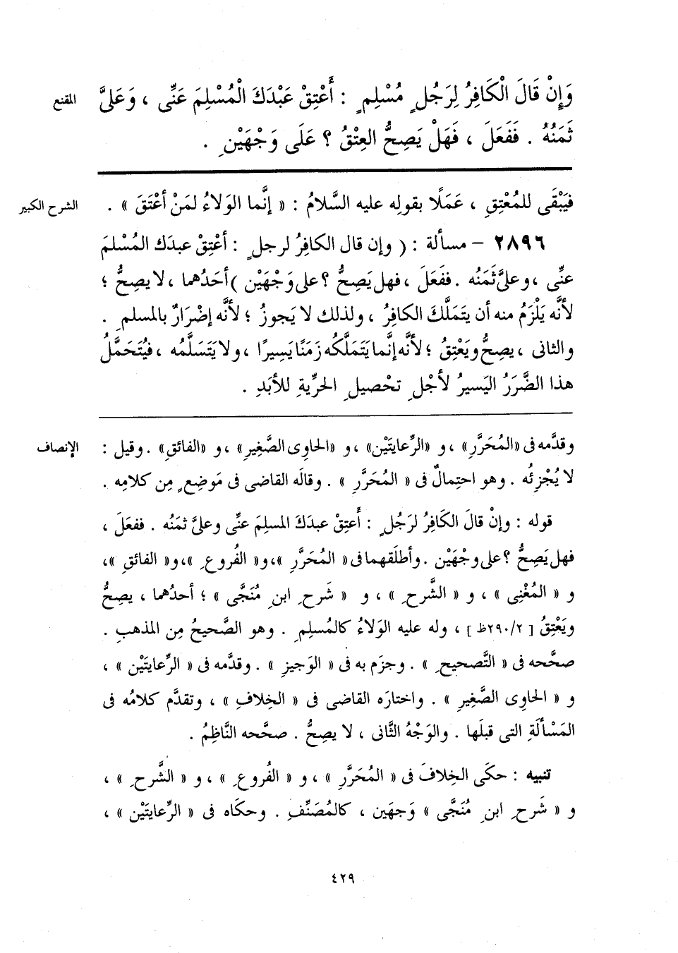 قوله: وإنْ قال الكَافِرُ لرَجُل: أعتِقْ عبدَكَ المسلِمَ عني وعليَّ ثمَنُه. ففعَلَ، فهل يَصِح؟ على وجْهين. وأطلَقهما في «المُحَرَّرِ»، و «الفُروعِ»، و «الفائقِ»، و «المُغْنِي»، و «الشَّرحِ»، و «شَرحِ ابنِ مُنَجَّى»؛ أحدُهما، يصِحُّ ويَعتِقُ، وله عليه الوَلاءُ كالمُسلِمِ. وهو الصَّحيحُ مِن المذهبِ. صحَّحه في «التَّصحيحِ». وجزَم به في «الوَجيزِ». وقدَّمه في «الرِّعايتَين»، و «الحاوي الصغِيرِ». واختارَه القاضي في «الخِلافِ»، وتقدَّم كلامُه في المَسْألَةِ التي قبلَها. والوَجْهُ الثَّاني، لا يصِحُّ. صحَّحه النَّاظِمُ.