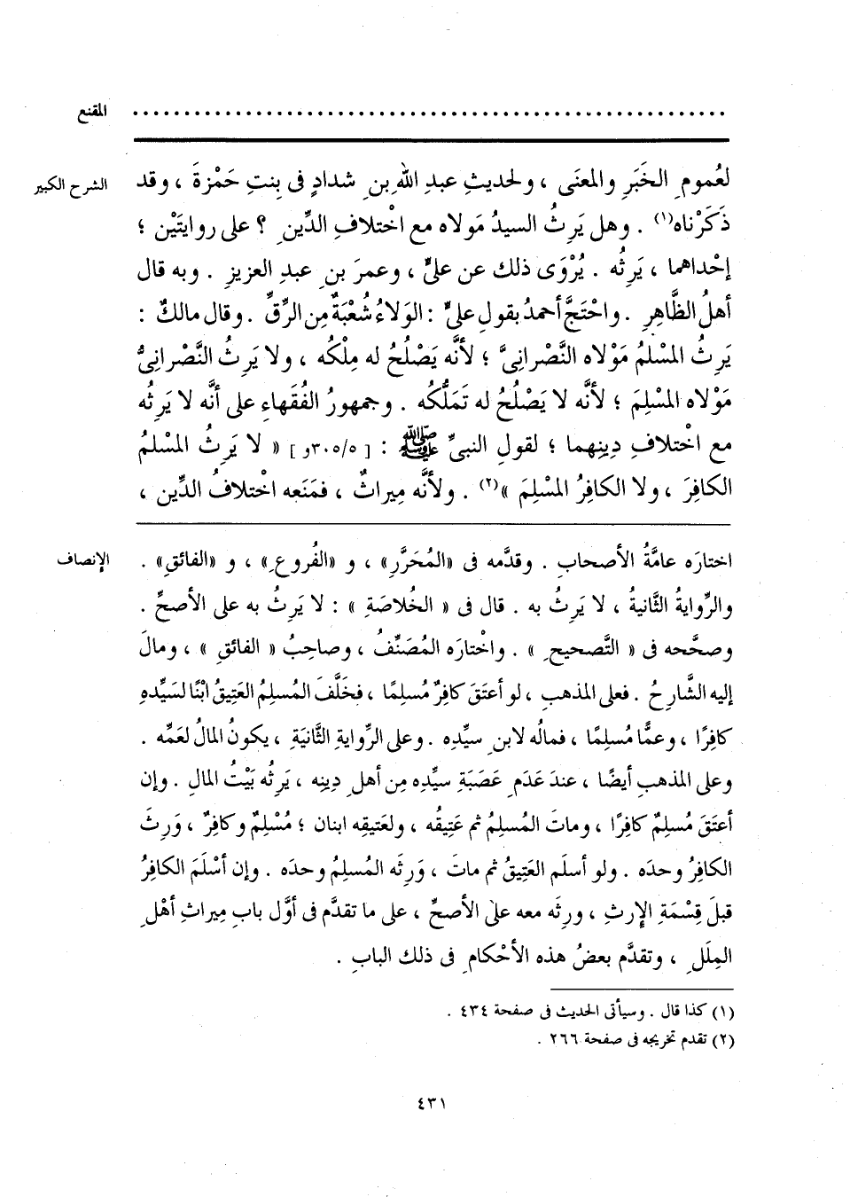 اختارَه عامَّةُ الأصحابِ. وقدَّمه في «المُحَرَّرِ»، و «الفُروعِ»، و «الفائقِ». والرِّوايةُ الثَّانيةُ، لا يَرِثُ به. قال في «الخُلاصَةِ»: لا يَرِثُ به على الأصحِّ. وصحَّحه في «التَّصحيحِ». واخْتارَه المُصَنِّفُ، وصاحِبُ «الفائقِ»، ومال إليه الشَّارِحُ. فعلى المذهبِ، لو أعتَقَ كافِرٌ مُسملِمًا، فخَلَّفَ المُسلِمُ العَتِيقُ ابْنًا لسَيِّدهِ كافِرًا، وعمًّا مُسلِمًا، فمالُه لابنِ سيِّدِه. وعلى الرِّوايةِ الثَّانيَةِ، يكونُ المالُ لعَمِّه. وعلى المذهبِ أيضًا، عندَ عَدَمِ عَصَبَةِ سيِّدِه مِن أهلِ دينه، يَرِثُه بَيتُ المالِ. وإن أعتَقَ مُسلِمٌ كافِرًا، وماتَ المُسلِمُ ثم عَتِيقُه، ولعَتيقِه ابنان، مُسْلِم وكافِر، وَرِثَ الكافِرُ وحدَه. ولو أسلَم العَتِيقُ ثم ماتَ، وَرِثَه المُسلِمُ وحدَه. وإن أسْلَمَ الكافِرُ قبلَ قِسْمَةِ الإرثِ، ورِثَه معه على الأصحِّ، على ما تقدَّم في أوَّل بابِ مِيراثِ أهْلِ المِلَلِ، وتقدَّم بعضُ هذه الأحكامِ في ذلك البابِ.
