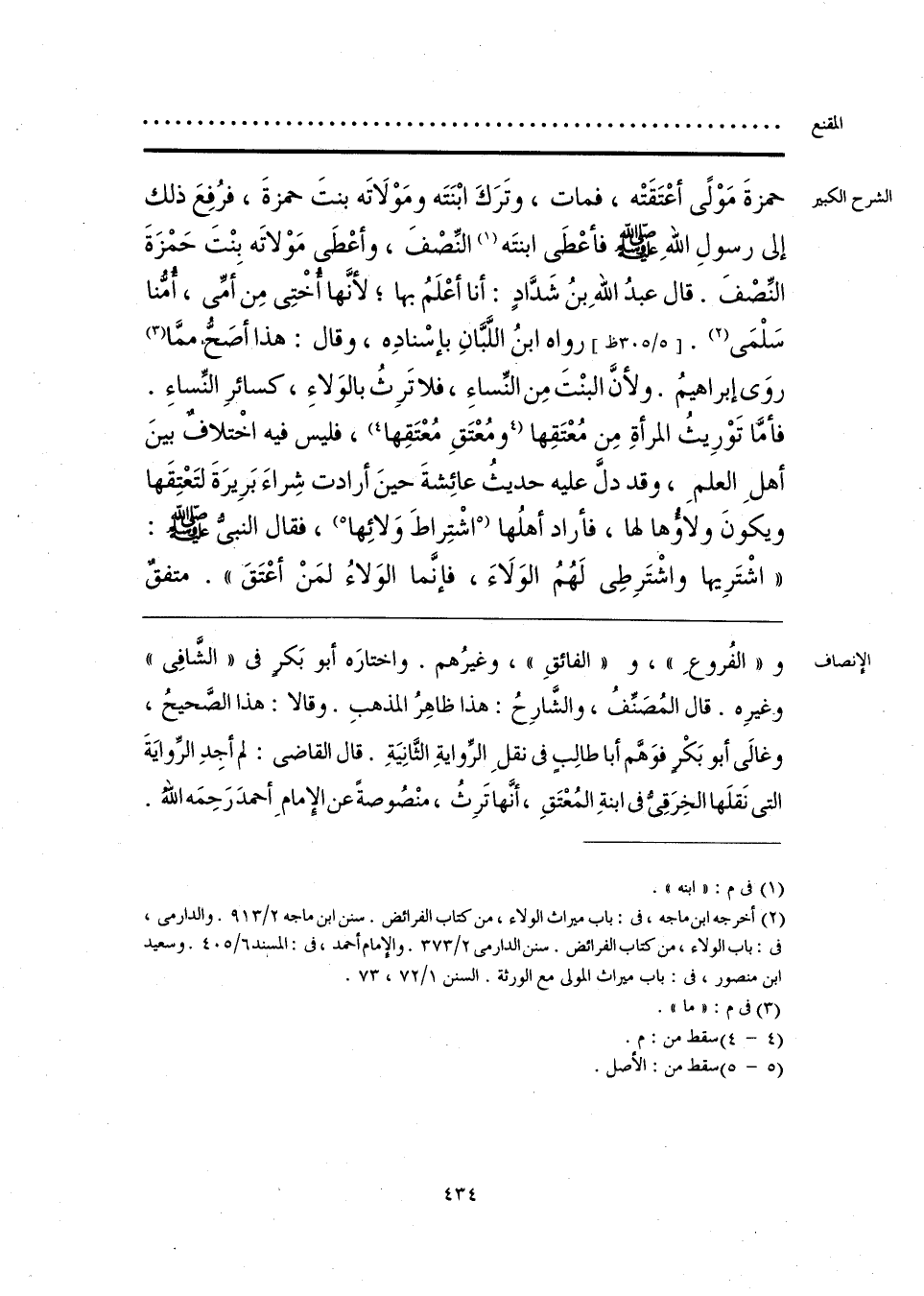 و «الفُروعِ»، و «الفائقِ»، وغيرُهم. واختارَه أبو بَكر في «الشَّافِي» وغيرِه. قال المُصَنِّفُ، والشَّارِحُ: هذا ظاهِرُ المذهبِ. وقالا: هذا الصَّحيحُ، وغالَى أبو بَكْرٍ فوَهَّم أبا طالب في نقلِ الروايةِ الثَّانِيَةِ. قال القاضي: لم أجِدِ الرِّوايَةَ التي نَقلَها الخِرَقِيُّ في ابنةِ المُعتَقِ، أنَّها تَرِثُ، منْصُوصةً عن الإِمامِ أحمدَ رَحِمَه الله.