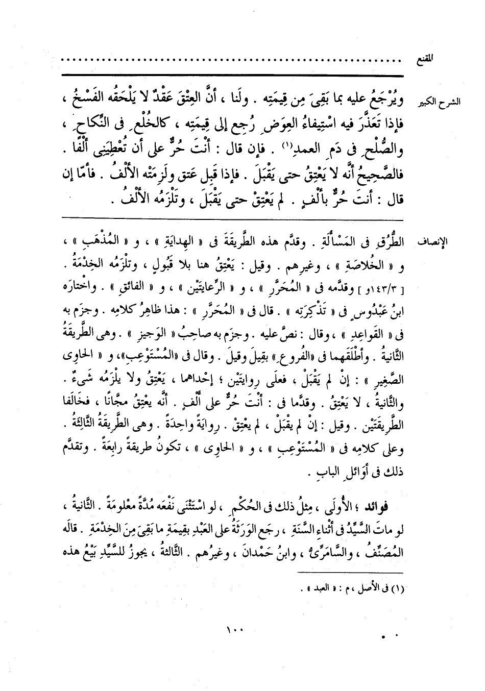 الطُّرُقِ في المَسْأَلَةِ. وقدَّم هذه الطَّريقَةَ في «الهِدايَةِ»، و «المُذْهَبِ»، و «الخُلاصَةِ»، وغيرِهم. وقيل: يَعْتِقُ هنا بلا قَبُولٍ، وتلْزَمُه الخِدْمَةُ. وقدَّمه في «المُحَرَّرِ»، و «الرِّعايتَين»، و «الفائقِ». واخْتارَه ابنُ عَبْدُوسٍ في «تَذْكِرَتِه». قال في «المُحَرَّرِ»: هذا ظاهِرُ كلامِه. وجزَم به في «القَواعِدِ»، وقال: نصَّ عليه. وجزَم به صاحِبُ «الوَجيزِ». وهي الطَّريقَةُ الثَّانيةُ. وأطْلَقَهما في «الفُروعِ» بقِيلَ وقيلَ. وقال في «المُسْتَوْعِبِ»، و «الحاوي الصَّغِيرِ»: إنْ لم يَقْبَلْ، فعلَى رِوايتَين؛ إحْداهما، يَعْتِقُ ولا يلْزَمُه شَيءٌ. والثَّانيةُ، لا يَعْتِقُ. وقدَّما في: أنْتَ حُرٌّ على أَلْفٍ. أنَّه يعْتِقُ مجَّانًا، فخَالفا الطَّرِيقَتَين. وقيل: إنْ لم يقْبَلْ، لم يعْتِقْ. رِوايَةً واحِدَةً. وهي الطَّرِيقَةُ الثَّالِثَةُ. وعلى كلامِه في «المُسْتَوْعِبِ»، و «الحاوي»، تكونُ طريقةً رابِعَةً. وتقدَّم ذلك في أوَائلَ البابِ.