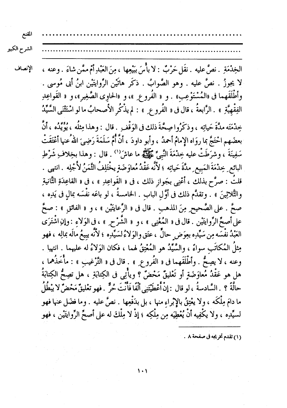 الخِدْمَةِ. نصَّ عليه. نقَل حَرْبٌ: لا بأْسَ ببَيعِها، مِنَ العَبْدِ أمْ ممَّن شاءَ. وعنه، لا يجوزُ. نصَّ عليه. وهو الصَّوابُ. ذكَر هاتَين الرِّوايتَين ابنُ أبي مُوسى. وأطْلَقَهما في «المُسْتَوْعِبِ». و «الفُروعِ»، و «الحاوي الصَّغِيرِ»، و «القَواعِدِ الفِقْهِيَّةِ». الرَّابعةُ، قال في «الفُروعِ»: لم يذْكُرِ الأصحابُ ما لو اسْتَثْنَى السَّيِّدُ خِدْمَتَه مدَّةَ حَياتِه، وذكَرُوا صِحَّةَ ذلك في الوَقْفِ. قال: وهذا مِثلُه، يُؤيِّدُه، أنَّ بعضَهم احْتَجَّ بما روَاه الإِمامُ أحمدُ، وأبو داودَ، أنَّ أُمَّ سَلَمَةَ رَضِيَ اللهُ عنها أَعْتَقَتْ سَفِينَةَ، وشرَطَتْ عليه خِدْمَةَ النَّبِيِّ - صلى الله عليه وسلم - ما عاشَ (¬1). قال: وهذا بخِلافِ شَرْطِ البائعِ خِدْمَةَ المَبِيعِ مدَّةَ حَياتِه؛ لأنَّه عَقْدُ مُعاوَضَةٍ يخْتَلِفُ الثَّمَنُ لأَجْلِه. انتهى. قلتُ: صرَّح بذلك، أعْنِي بجَوازِ ذلك، في «القَواعِدِ»، في «القاعِدَةِ الثَّانيةِ والثَّلاثِينَ». وتقدَّم ذلك في أوَّلِ البابِ. الخامسةُ، لو باعَه نفسَه بمالٍ في يَدِه، صحَّ. على الصَّحيحِ مِنَ المذهبِ. قال في «الرِّعايتَين»، و «الفائقِ»: صحَّ على أصحِّ الرِّوايتَين. قال في «المُغْنِي»، و «الشَّرْحِ»، في الوَلاءِ: وإنِ اشْتَرَى العَبْدُ نفْسَه مِن سَيِّدِه بعِوَضٍ حالٍّ، عتَق والوَلاءُ لسَيِّدِه؛ لأنَّه يبِيعُ ماله بمالِه، فهو مِثلُ المُكاتَبِ سواءٌ، والسَّيِّدُ هو المُعْتِقُ لهما، فكان الوَلاءُ له عليهما. انتهيا. وعنه، لا يصِحُّ. وأطْلَقَهما في «الفُروعِ». قال في «التَّرْغيبِ»: مأْخَذُهما، هل هو عَقْدُ مُعاوَضَةٍ أو تَعْليقٌ مَحْضٌ؟ ويأْتِي في الكِتابَةِ، هل تصِحُّ الكِتابَةُ حالَّةً؟. السَّادسةُ، لو قال: إنْ أَعْطَيتَنِي ألْفًا فَأَنْتَ حُرٌّ. فهو تعْليقٌ مَحْضٌ لا ييطُلُ ما دامَ مِلْكَه، ولا يعْتِقُ بالإِبْراءِ منها، بل بدَفْعِها. نصَّ عليه. وما فضَل عنها فهو لسيِّدِه، ولا يكْفِيه أنْ يُعْطِيَه مِن مِلْكِه؛ إذْ لا مِلْكَ له على أصحِّ الرِّوايتَين، فهو