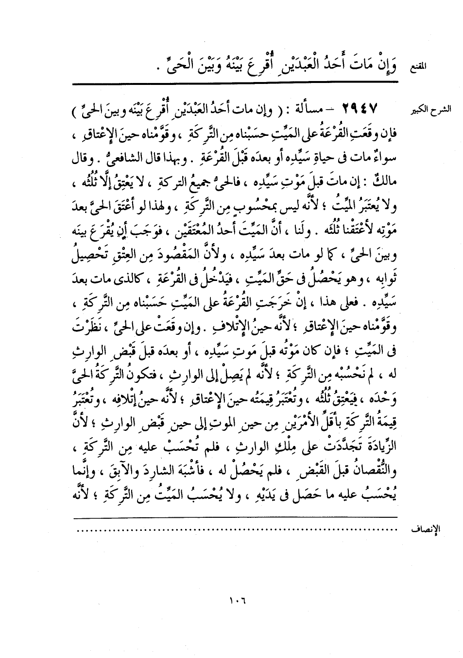 وَإِنْ مَاتَ أَحدُ الْعَبْدَينِ أُقْرِعَ بَينَهُ وَبَينَ الْحَيِّ.