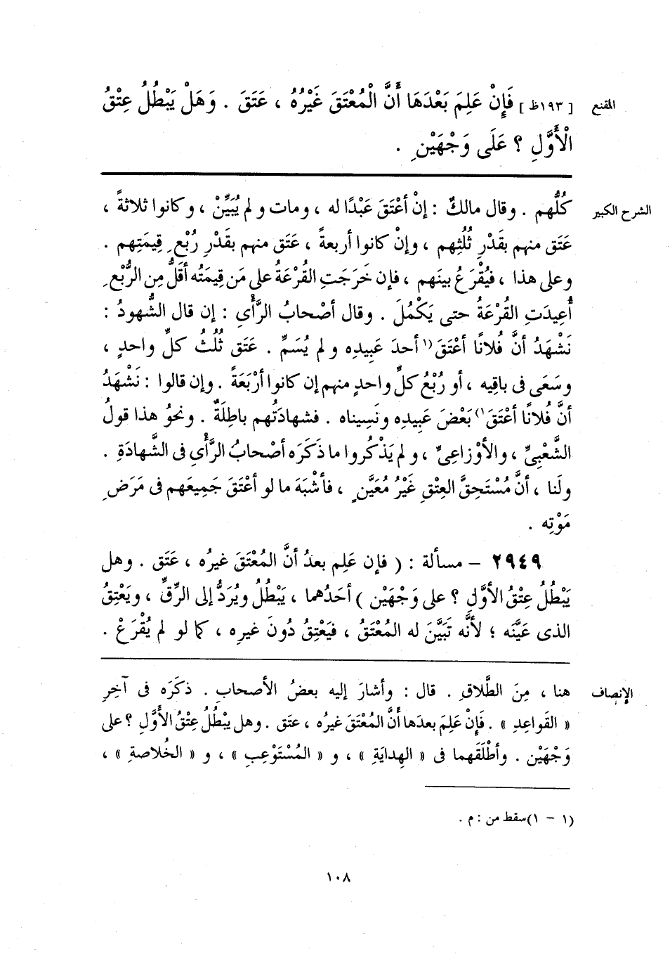 هنا، مِنَ الطَّلاقِ. قال: وأشارَ إليه بعضُ الأصحابِ. ذكَرَه في آخِرِ «القَواعِدِ». فَإنْ عَلِمَ بعدَها أنَّ المُعْتَقَ غيرُه، عتَق. وهل يبْطُلُ عِتْقُ الأَوَّلِ؟ على وَجْهَين. وأطْلَقَهما في «الهِدايَةِ»، و «المُسْتَوْعِبِ»، و «الخُلاصةِ»،