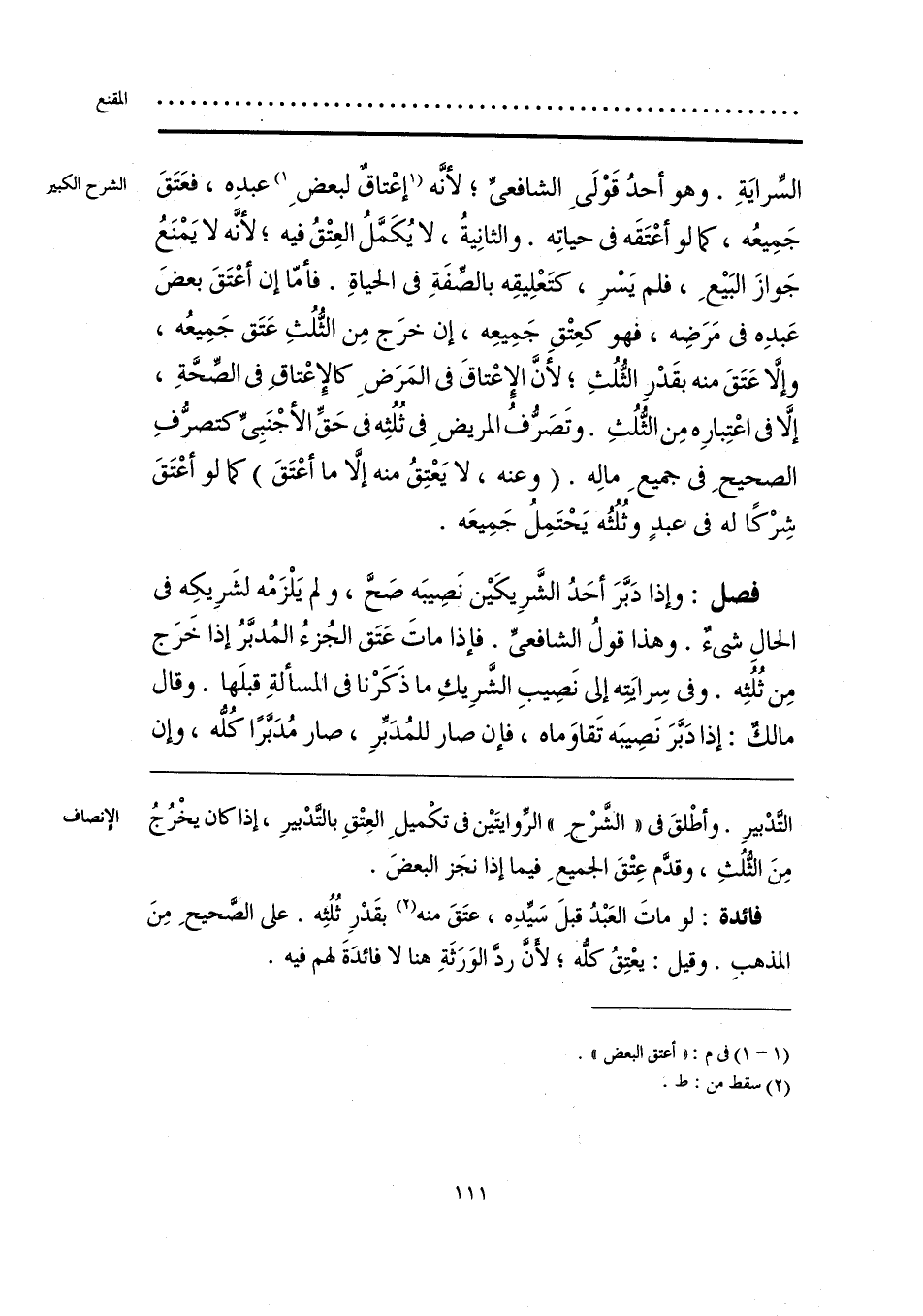 التَّدْبيرِ. وأطْلقَ في «الشَّرْحِ» الرِّوايتَين في تكْميلِ العِتْقِ بالتّدْبيرِ، إذا كان يخْرُجُ مِنَ الثُّلُثِ، وقدَّم عِتْقَ الجميعِ فيما إذا نجَز البعضَ.