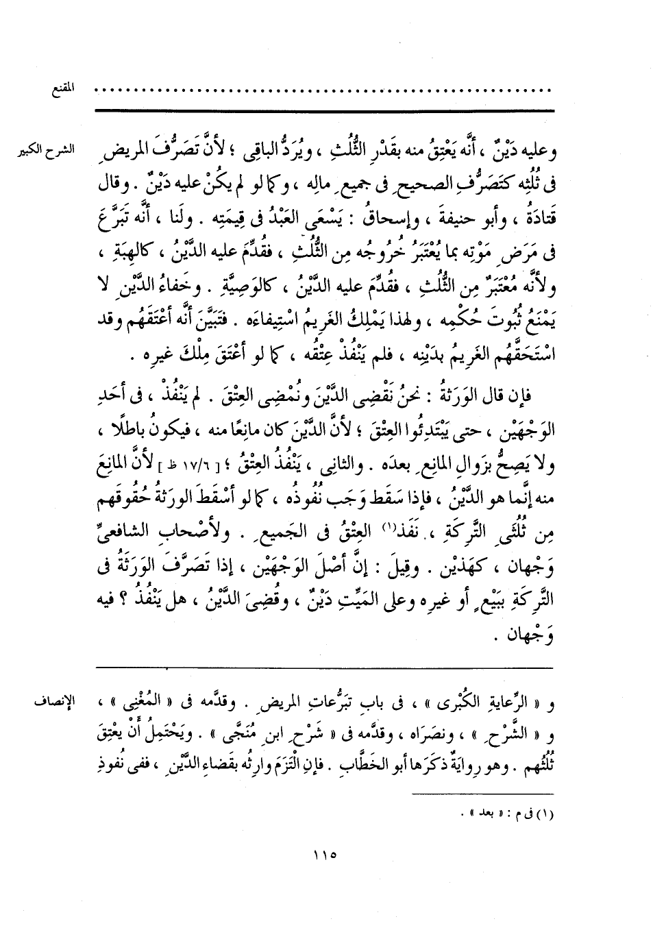 و «الرِّعايةِ الكُبْرى»، في بابِ تبَرُّعاتِ المريضِ. وقدَّمه في «المُغْنِي»، و «الشَّرْحِ»، ونصَرَاه، وقدَّمه في «شَرْحِ ابنِ مُنَجَّى». ويَحْتَمِلُ أَنْ يعْتِقَ ثُلُثُهم. وهو رِوايَةٌ ذكَرَها أبو الخَطَّابِ. فإنِ الْتَزَمَ وارِثُه بقَضاءِ الدَّينِ، ففي نُفوذِ