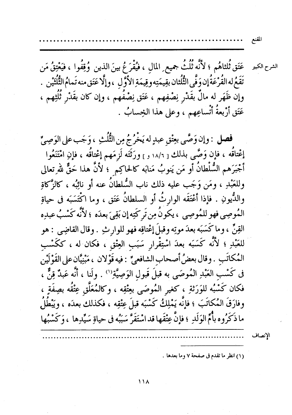 فصل: وإن وَصَّى بعِتْقِ عبدٍ له يَخْرُجُ مِن الثُّلُثِ، وَجَب على الوَصِيِّ إعْتاقُه، فإن وَصَّى بذلك ورَثَتَه لَزِمَهم إعْتاقُه، فإنِ امْتَنَعُوا أجْبَرَهم السُّلْطانُ أو مَن يَنوبُ مَنابَه كالحاكِمِ؛ لأنَّ هذا حَقٌّ للهِ تعالى وللعَبْدِ، ومَن وَجَب عليه ذلك ناب السُّلطانُ عنه أو نائِبُه، كالزَّكاةِ والدُّيونِ. فإذا أعْتَقَه الوارِثُ أو السلطانُ عَتَق، وما اكْتَسَبَه في حياةِ المُوصِي فهو للمُوصِي، يكونُ مِن تَرِكَتِه إن بَقِيَ بعدَه؛ لأنَّه كَسْبُ عبدِه القِنِّ، وما كَسَبَه بعدَ موتِه وقبلَ إعْتاقِه فهو للوارِثِ. وقال القاضِي: هو للعَبْدِ؛ لأَنَّه كَسَبَه بعدَ اسْتِقْرارِ سَبَبِ العِتْقِ، فكانْ له، ككَسْبِ المُكاتَبِ. وقال بعضُ أصحابِ الشافعيِّ: فيه قَوْلان، مَبْنِيَّان على القَوْلَين في كَسْبِ العَبْدِ المُوصَى به قبلَ قَبولِ الوَصِيَّةِ (¬1). ولَنا، أنَّه عَبدٌ قِنٌّ، فكان كَسْبُه للوَرَثةِ، كغيرِ المُوصَى بعِتْقِه، وكالمُعَلَّقِ عِتْقُه بصِفَةٍ، وفارَقَ المُكاتَبَ؛ فإنَّه يَمْلِكُ كَسْبَه قبلَ عِتْقِه، فكذلك بعدَه، ويَبْطُلُ ما ذَكَرُوه بأُمِّ الوَلَدِ؛ فإنَّ عِتْقَها قد اسْتَقَرَّ سَبَبُه في حياةِ سَيِّدِها، وَكَسْبُها
