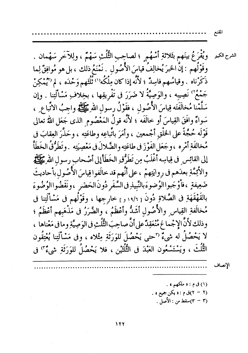 ويُقْرَعُ بينَهم بثَلاثةِ أسْهُمٍ؛ لصاحِبِ الثُّلُثِ سَهْمٌ، ولِلآخَرِ سَهْمان. وقَوْلُهم: إنَّ الخبرَ يُخالِفُ قياسَ الأُصُولِ. نَمْنَعُ ذلك، بل هو مُوافِقٌ لِما ذَكَرْناه. وقياسُهم فاسِدٌ؛ لأنَّه إذا كان مِلْكُه (¬1) ثُلُثَهم وَحْدَه، لم [يُمْكِنْ جَمْعُ] (¬2) نَصِيبِه، والوَصِيَّةُ لا ضَرَرَ في تَفْرِيقِها، بخِلافِ مَسْأَلتِنا. وإن سَلَّمْنا مُخالفَتَه قِياسَ الأُصُولِ، فقَوْلُ رسولِ اللهِ - صلى الله عليه وسلم - واجِبُ الاتِّباعِ، سَواءٌ وافَقَ القِياسَ أو خالفَه؛ لأنَّه قولُ المَعْصُومِ الذي جَعَل الله تعالى قَوْلَه حُجَّةً على الخلْقِ أجْمعين، وأمَرَ باتِّباعِه وطاعَتِه، وحَذَّرَ العِقابَ في مُخالفَةِ أمْرِه، وجَعَل الفَوْزَ في طاعَتِه والضَّلال في مَعْصِيَته. وتَطرُّقُ الخَطَأَ إلى القائِسِ في قِياسِه أغْلَبُ مِن تَطرُّقِ الخَطَأ إلى أصْحاب رسولِ اللهِ - صلى الله عليه وسلم - والأئِمَّةِ بعدَهم في رِوايَتهمْ، على أنَّهم قد خالفوا قِياسَ الأُصُولِ بأحاديثَ ضَعِيفةٍ، فأوْجَبوا الوُضوءَ بالنَّبِيذِ في السَّفَرِ دُونَ الحَضَرِ، ونَقَضُوا الوُضُوءَ بالقَهْقَهَةِ في الصَّلاةِ دُونَ خارِجِها، وقَوْلُهم في مَسْألَتِنا في مُخالفةِ القِياسِ والأصُولِ أشَدُّ وأعْظَمُ، والضَّرَرُ في مَذْهَبِهم أعْظَمُ؛ وذلك لأنَّ الإجْماعَ مُنْعَقِدٌ على أنَّ صاحِبَ الثُّلُثِ في الوَصِيَّةِ وما في مَعْناها، لا يَحْصُلُ له شيءٌ [حتى يَحْصُلَ للوَرَثَةِ مِثْلاه، وفي مَسْألَتِنا يُعْتِقُون الثُّلُثَ، ويَسْتَسْعُون العَبْدَ في الثُّلُثَين، فلا يَحْصُلُ للوَرَثَةِ شيءٌ] (¬3) في